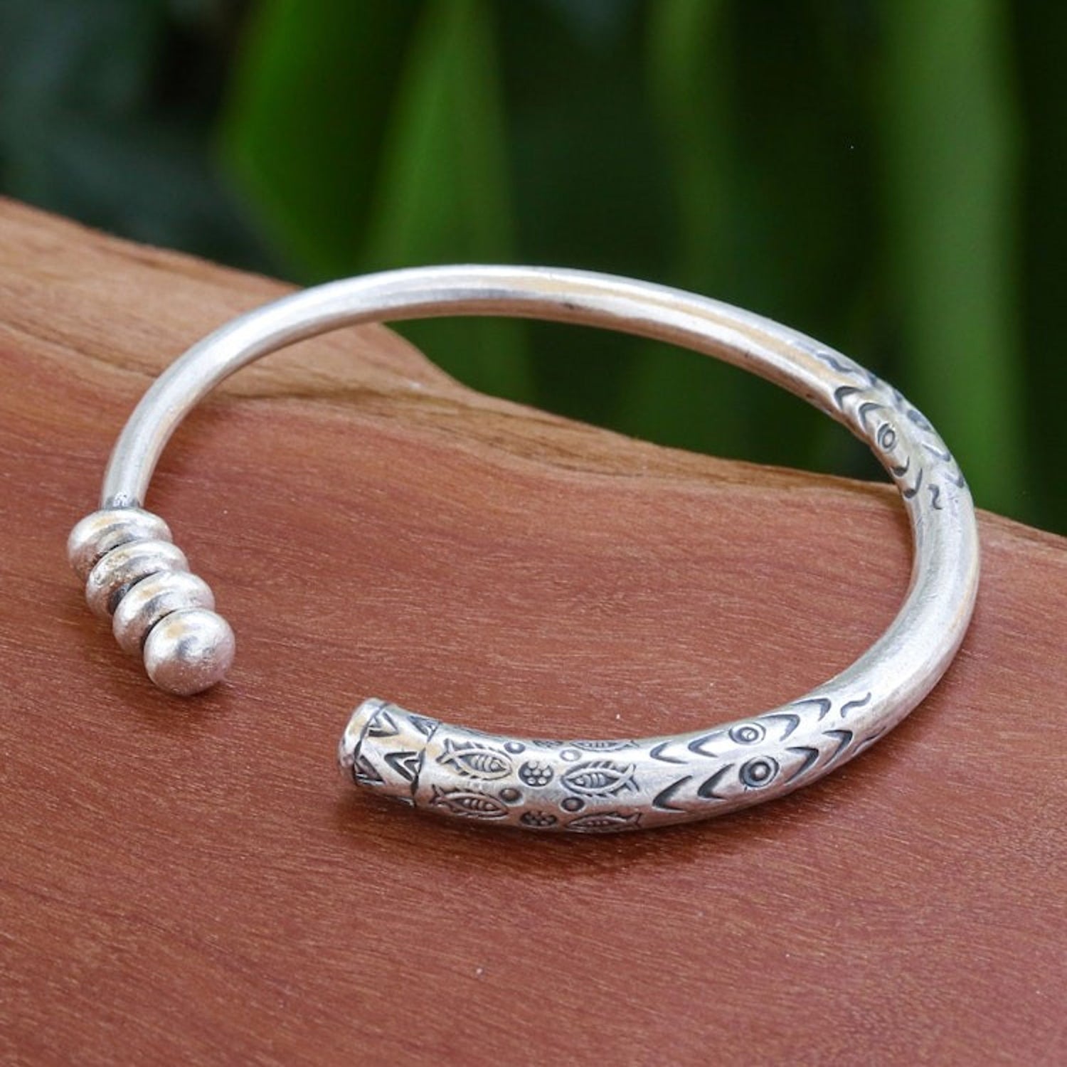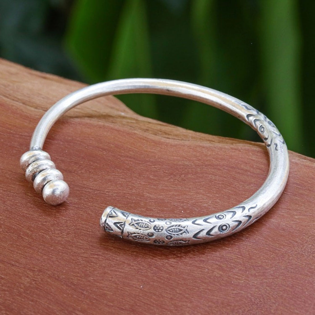 This Hill Tribe-Themed Silver Cuff Bracelet Crafted in Thailand 'Celestial Halo' is a minimalist and bold accessory. Designed by Pakaon Sojintarit, this silver cuff bracelet features an elegant structure with Thai Hill Tribe details and beads. The piece, which is crafted by expert Thai artisans, is a beautiful representation of the artisan's vision and her collaboration with local silversmiths.