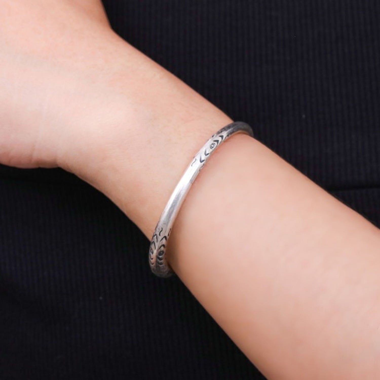 Handcrafted in Thailand with .950 silver. The bracelet is 6.8 inches in length (end to end) and 0.3 inches in width. It has a combination finish.