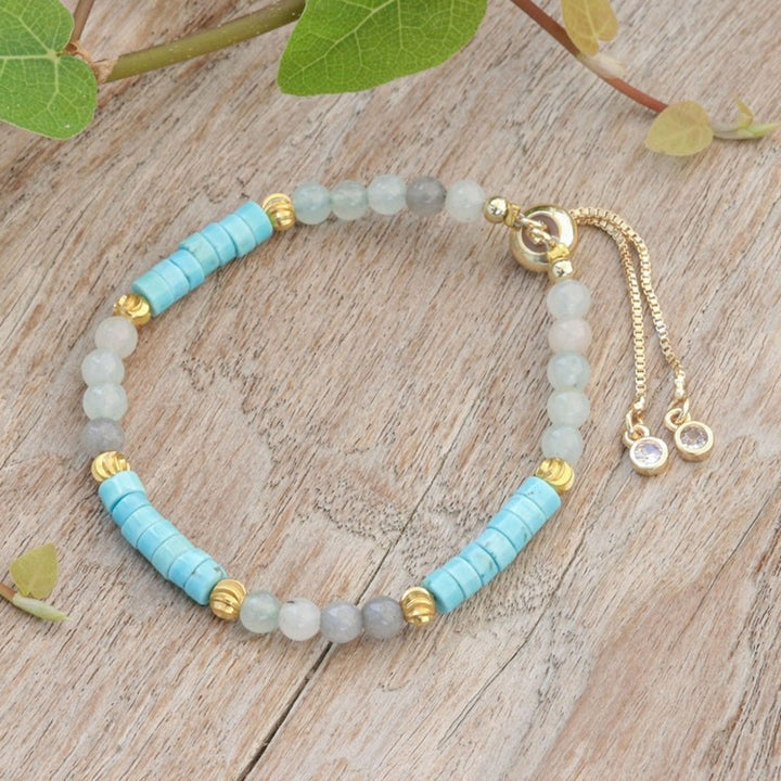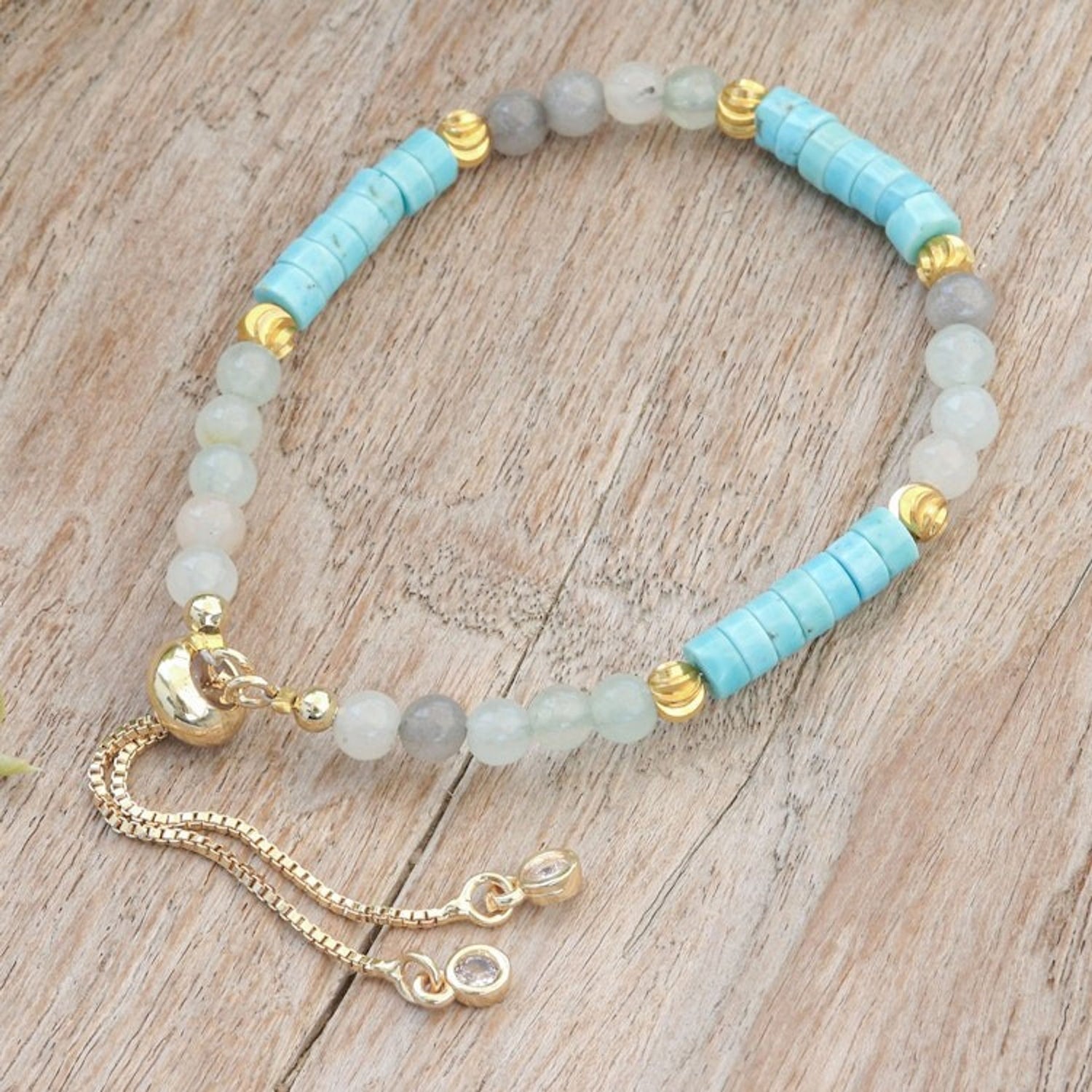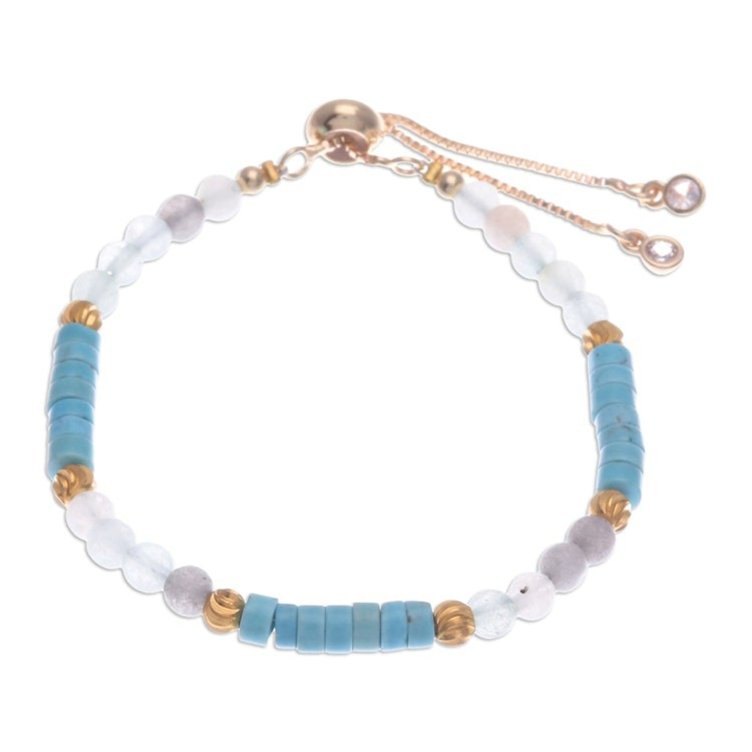 Handcrafted in Thailand with howlite, quartz, and brass. The bracelet adjusts from 6 to 8.8 inches in length. It has a combination finish. Colors may vary slightly.