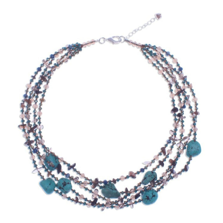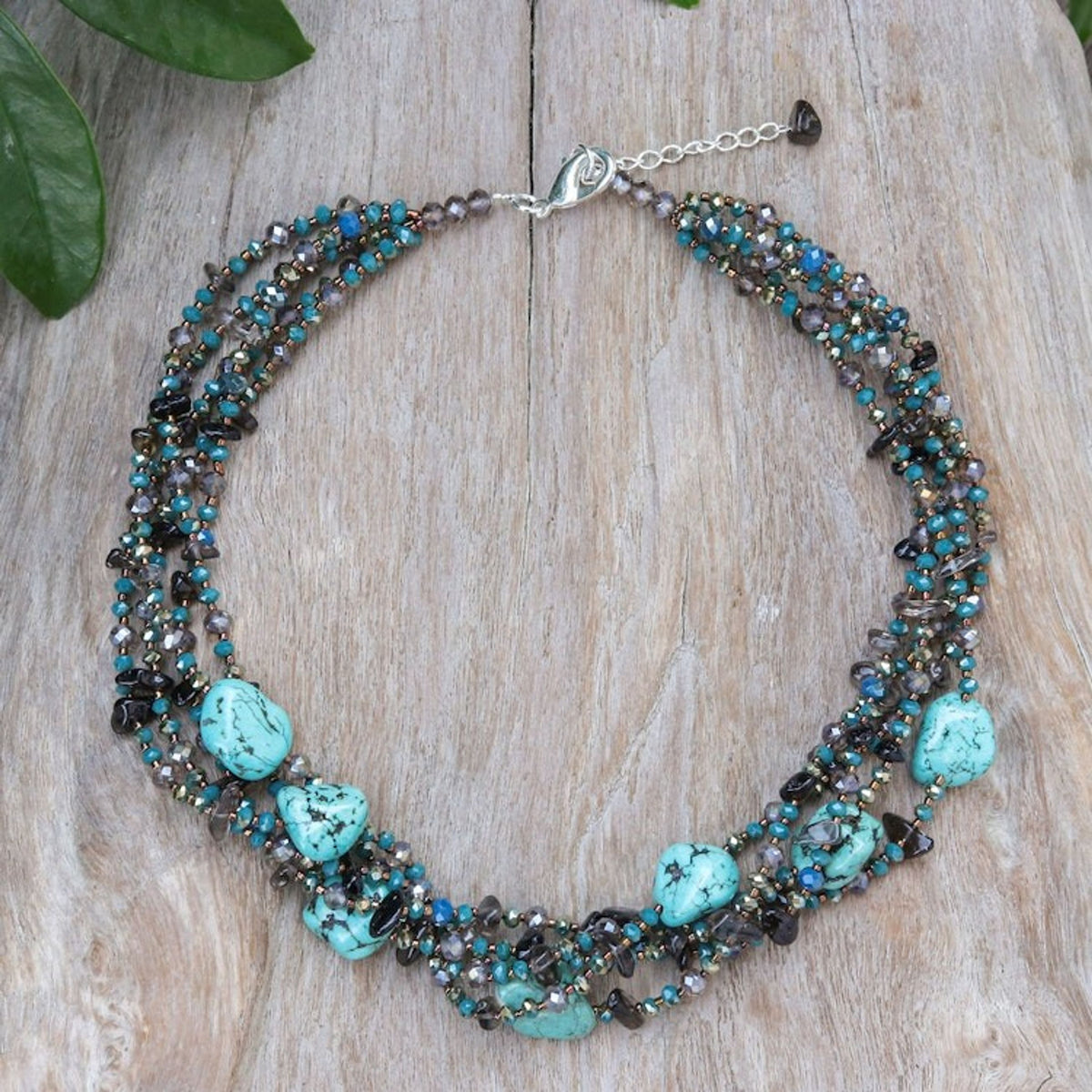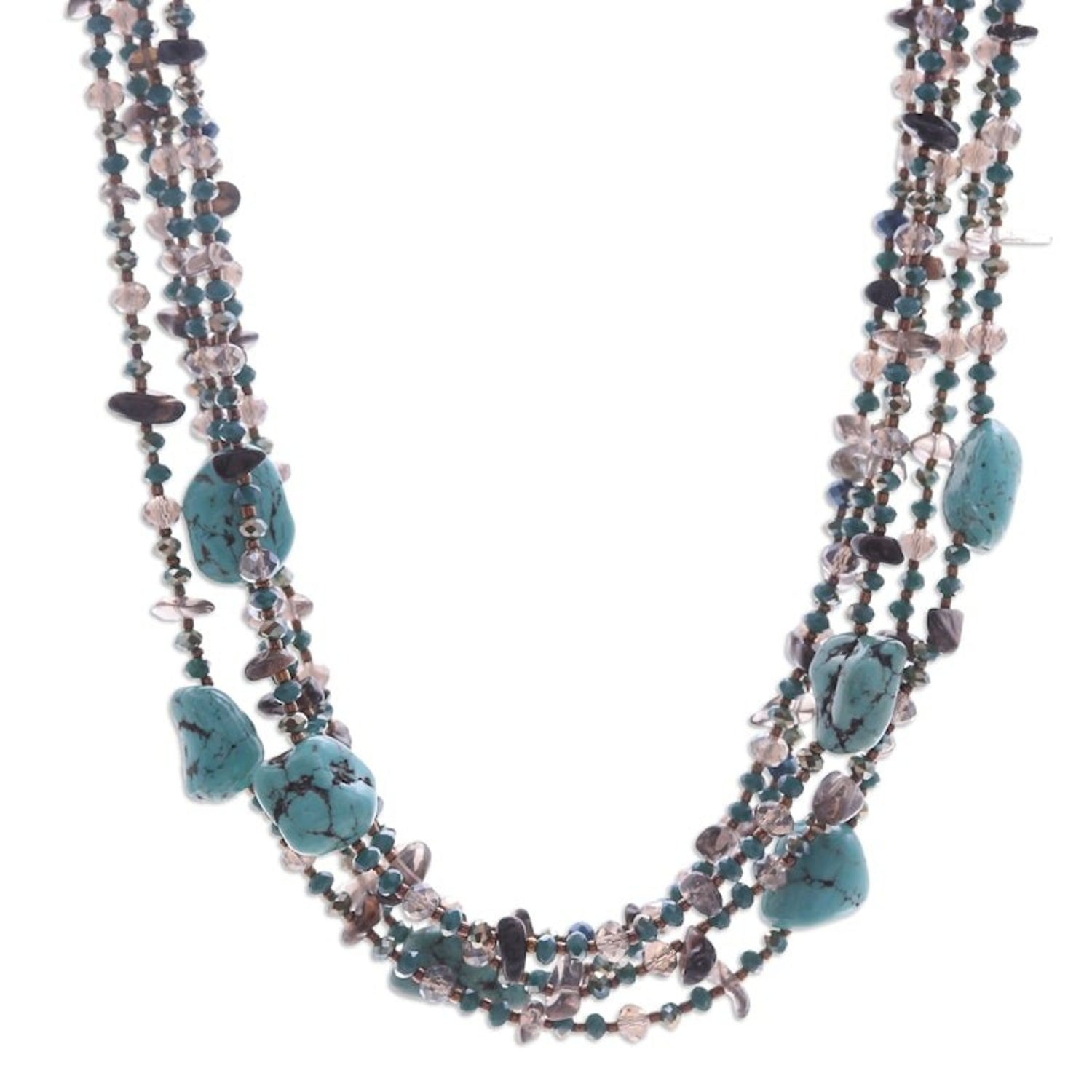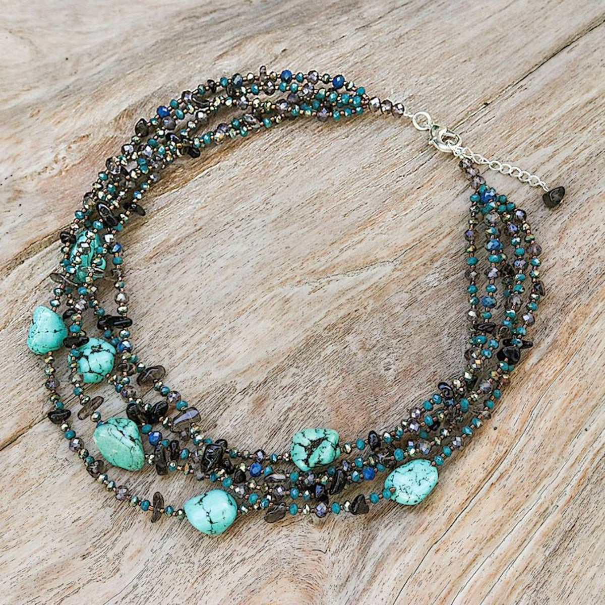 This Howlite Smoky Quartz and Glass Beaded Waterfall Necklace 'Spectacular Blue' is a dreamy and statement accessory. Designed by Nareerat, this waterfall necklace features five strands filled with gorgeous howlite and smoky quartz gemstones and glass beads. The piece, which celebrates the beauty of nature and color, is a beautiful representation of the artisan's mission to keep the art of handmade jewelry alive.