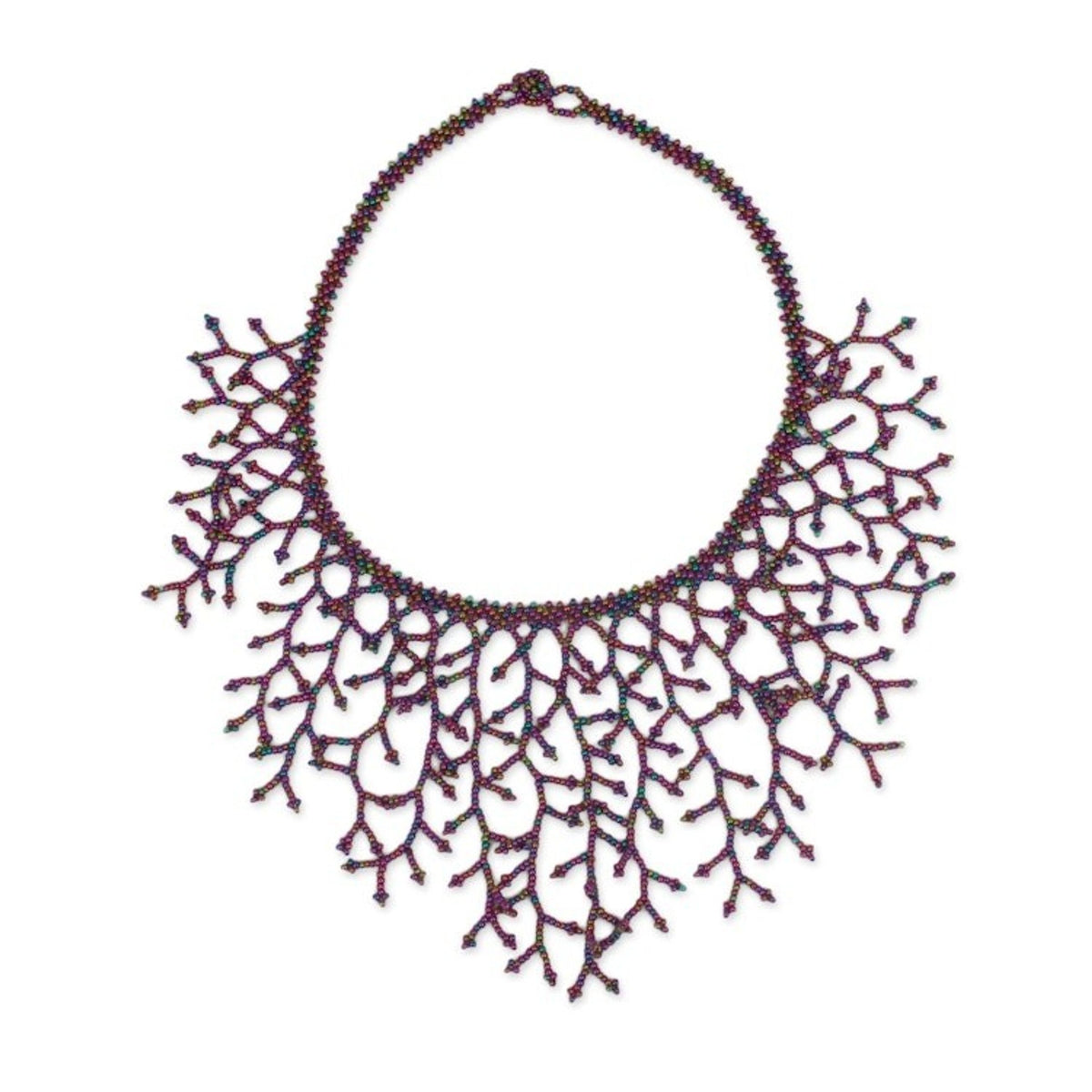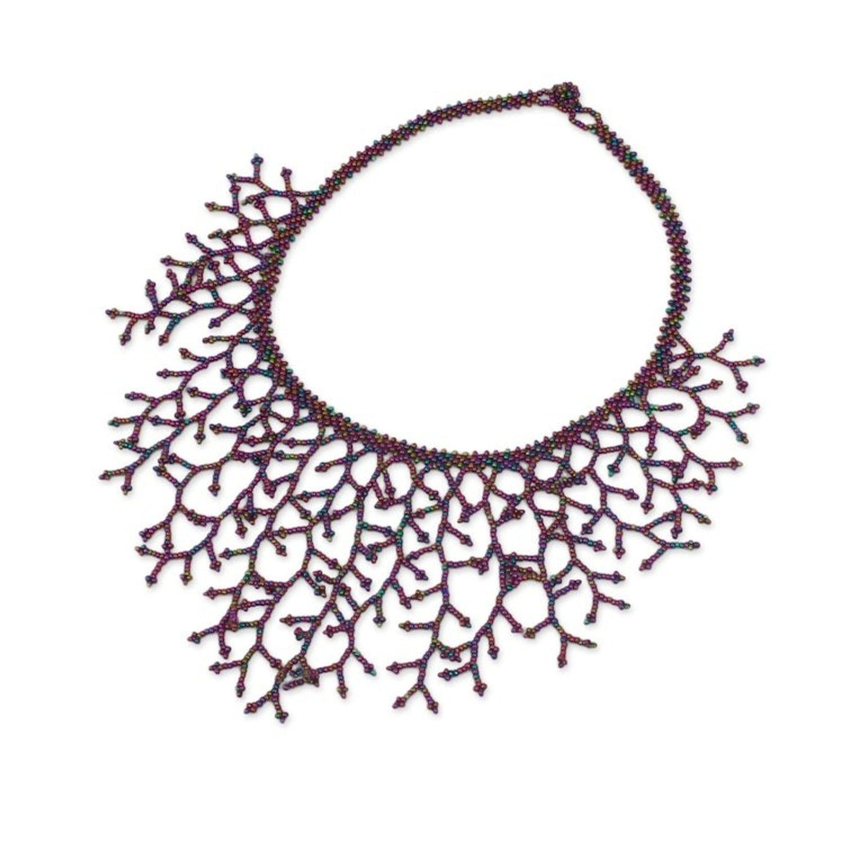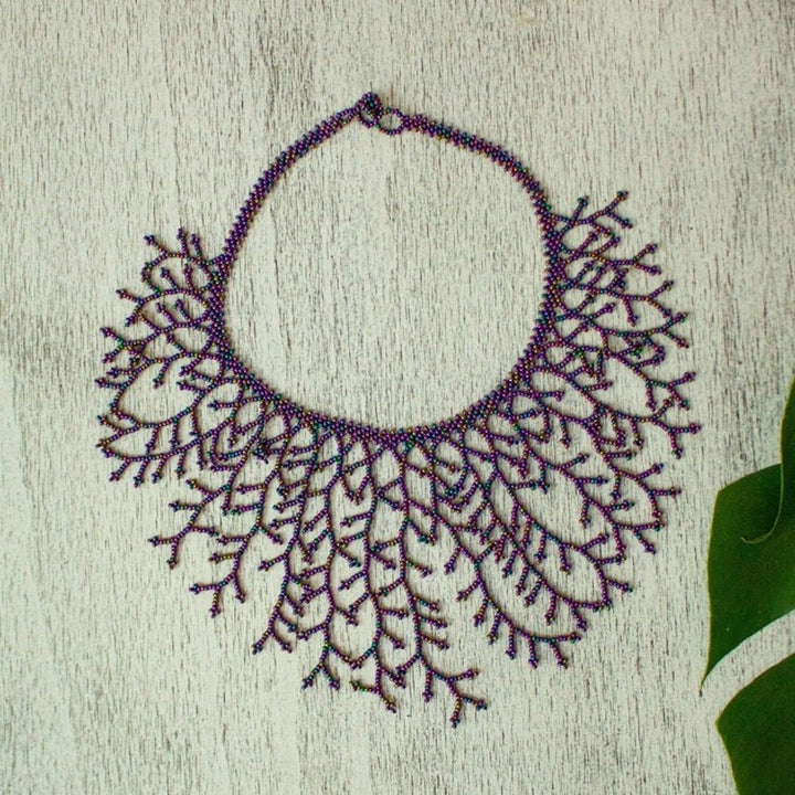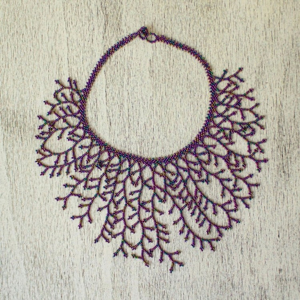 This Huichol Glass Beaded Waterfall Necklace from Mexico 'Ancient Roots' is a traditional and modern accessory. Designed by Adriana Trejo, this necklace features a waterfall of roots that fan out like lace, crafted from petite glass beads in iridescent greens and purple. The piece, which is a vibrant interplay of heritage and contemporary design, is a beautiful representation of the artisan's dedication and resilience.