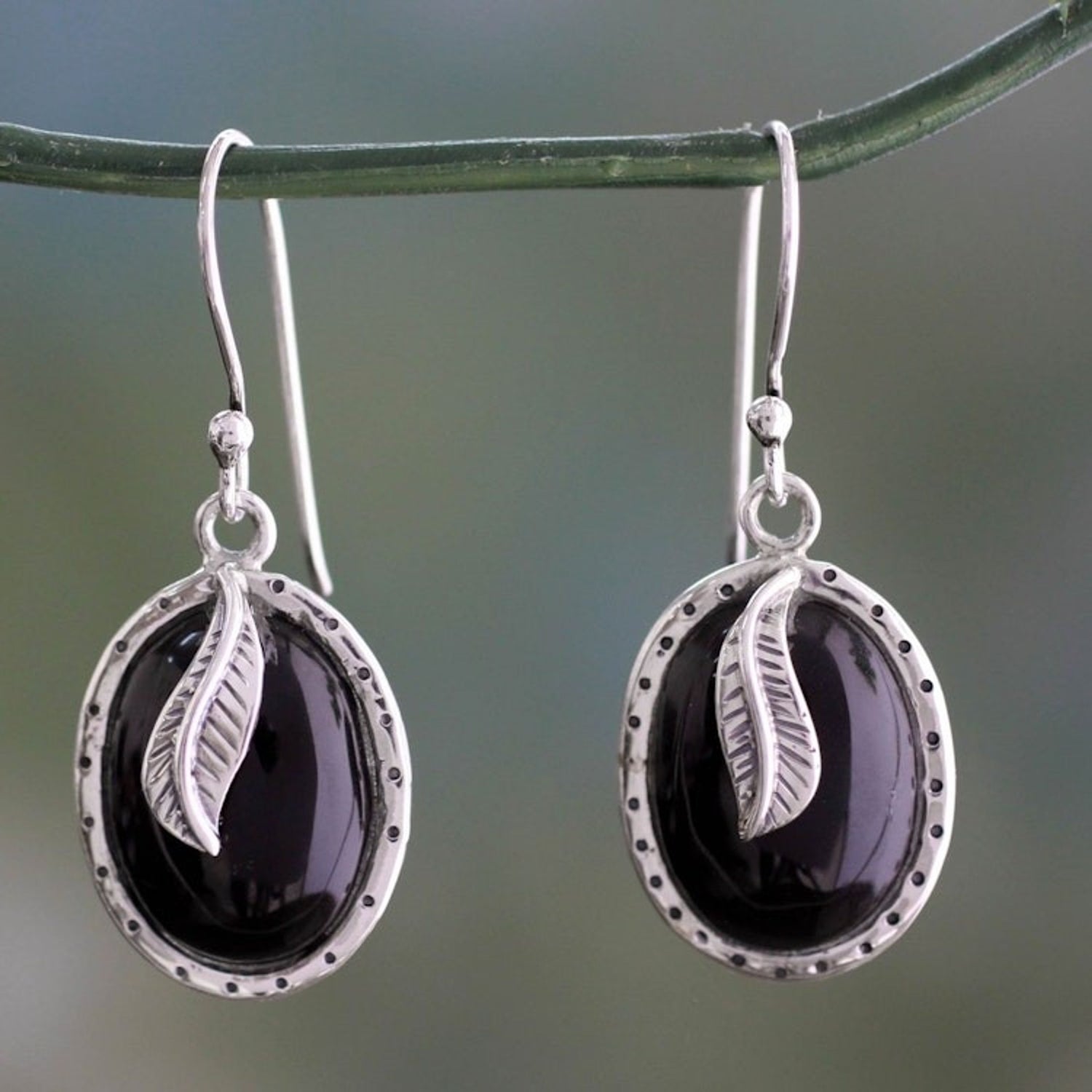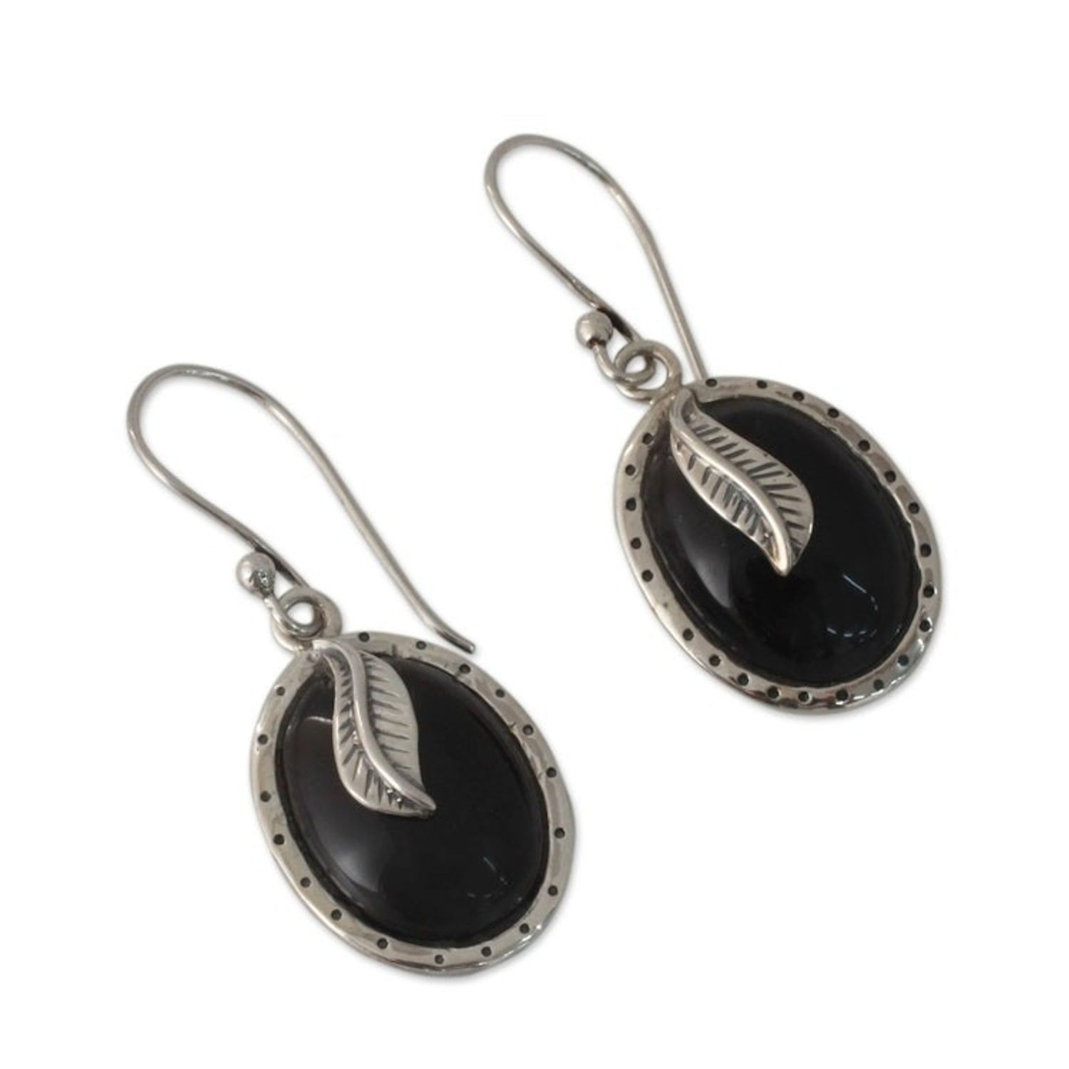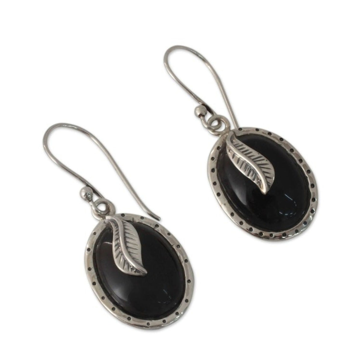 India Fair Trade Onyx and Sterling Silver Dangle Earrings 'Tender Leaves'