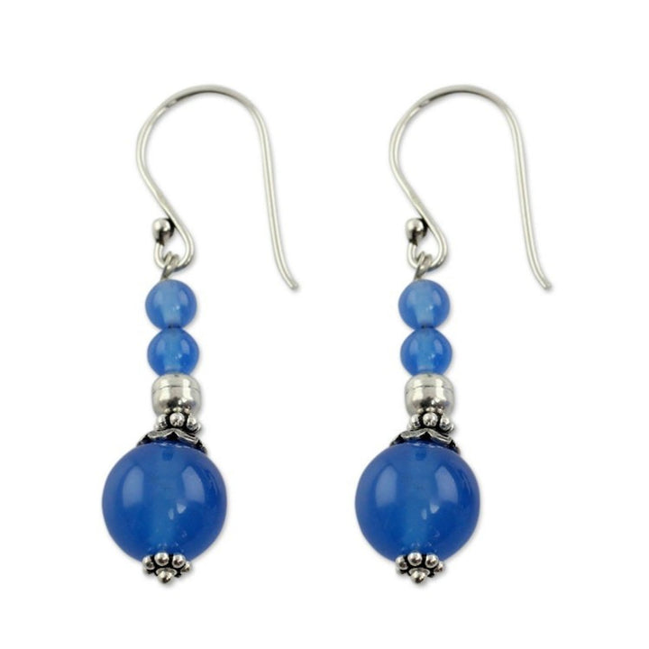 These India Handmade Chalcedony Earrings 'Heavenly' are an elegant and original accessory. Designed by Narayani, these earrings are handcrafted from sterling silver and feature sleek, blue, and beautiful enhanced chalcedony. The pieces, which reflect both heritage and discovery, are a beautiful representation of the artisan's innate elegance.