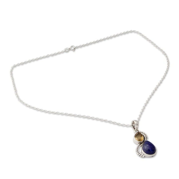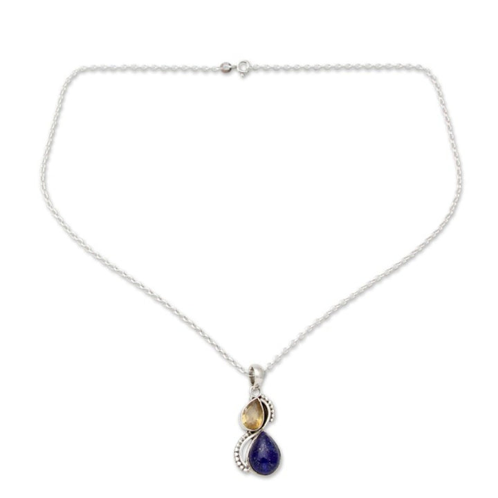 India Silver and Lapis Lazuli Necklace with Faceted Citrine 'Two Teardrops'