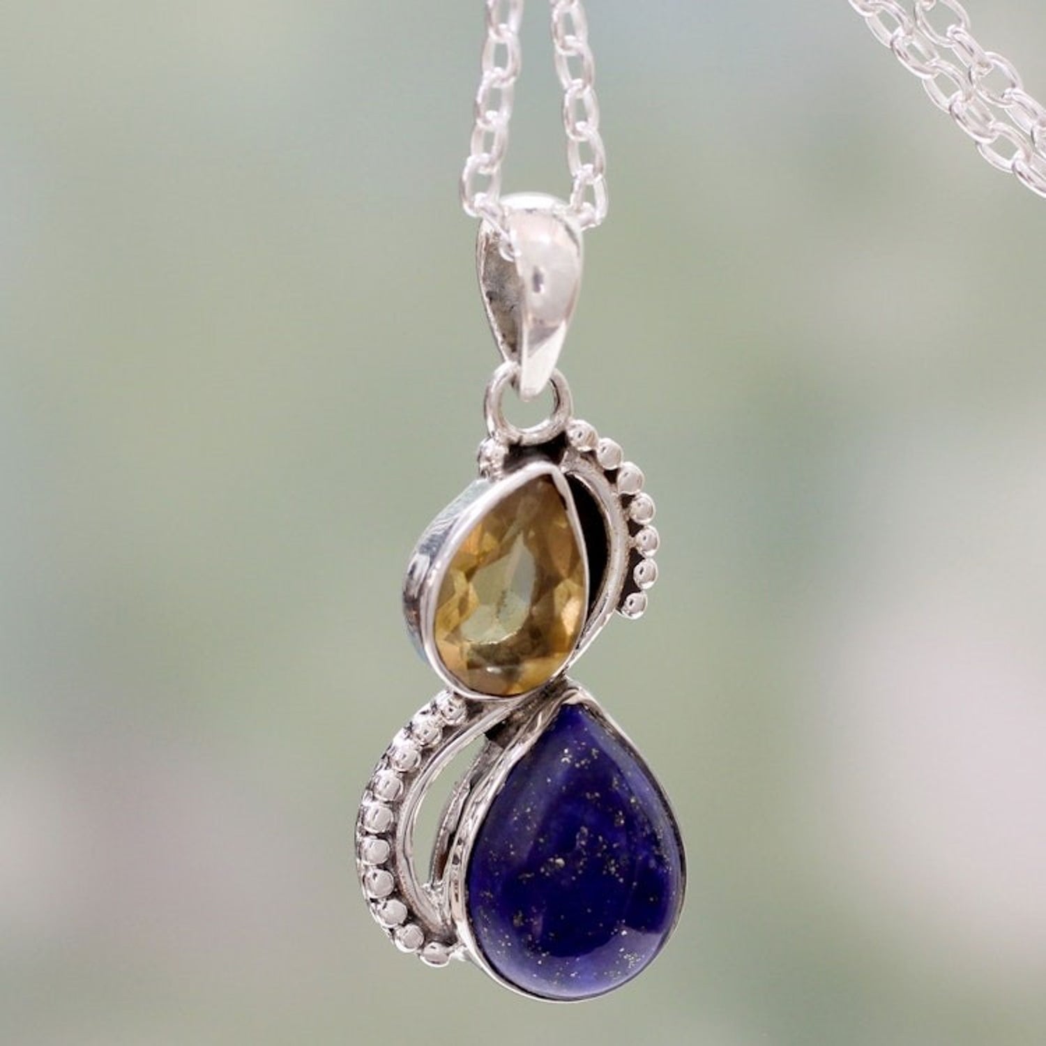 Handcrafted in India with .925 sterling silver, lapis lazuli, and citrine. The necklace is 18 inches long. The pendant measures 1.4 inches in length and 0.6 inches in width. It has a high-polish finish.