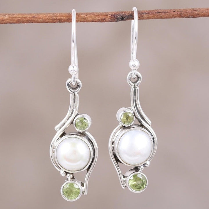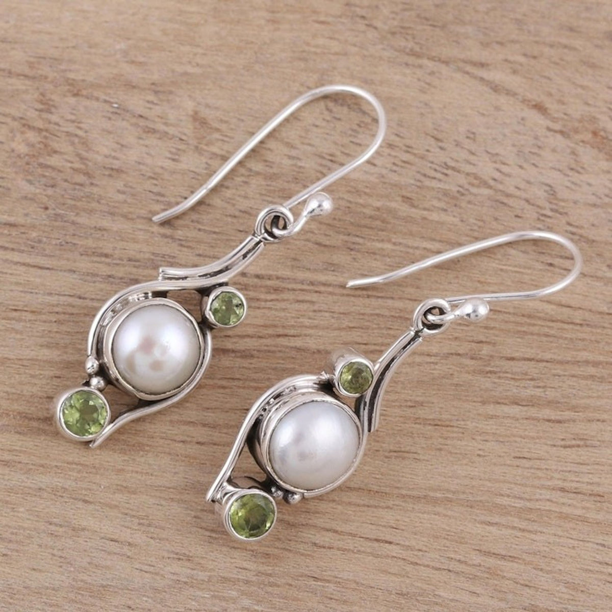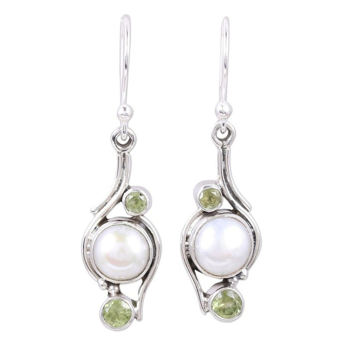Handcrafted in India with .925 sterling silver, freshwater pearls, and peridot. Each earring measures 1.2 inches in length and 0.5 inches in width. They have a high-polish finish. Natural variations in color and pattern are to be expected.