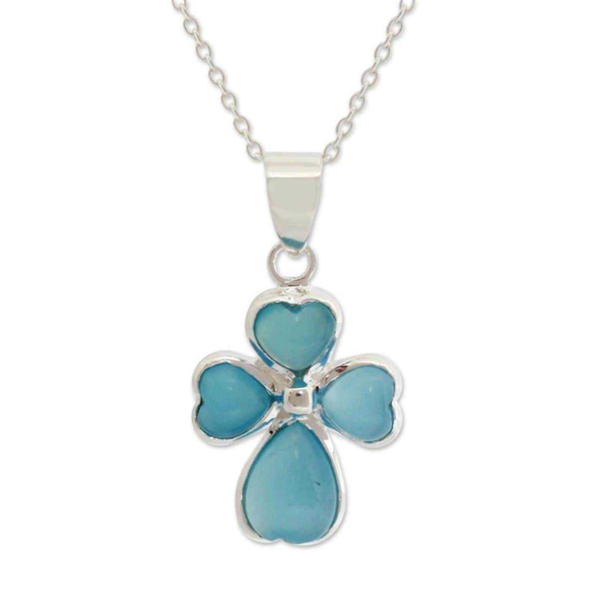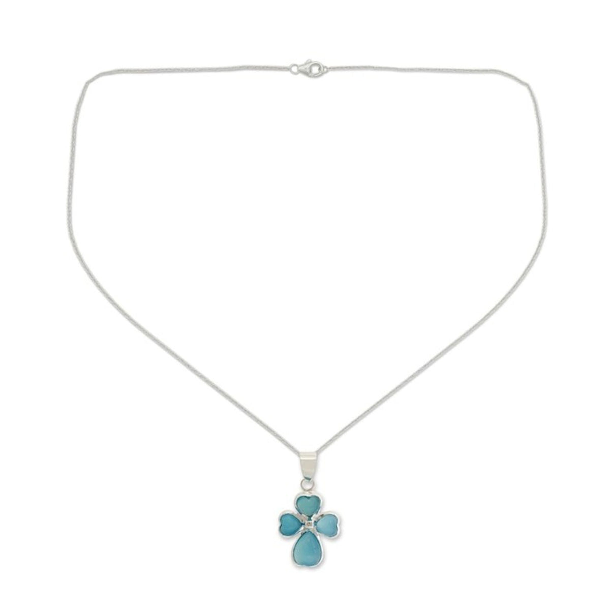 This Indian Cross Sterling Silver and Chalcedony Necklace 'Heartfelt' is a graceful and elegant accessory. Designed by Mahavir, this necklace features a florid cross pendant with segments shaped like hearts and set with sky blue enhanced chalcedony cabochons. The piece, which unites tradition and modernity, is a beautiful representation of the artisan's passion for creativity and his dedication to his craft.