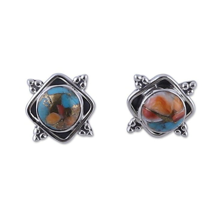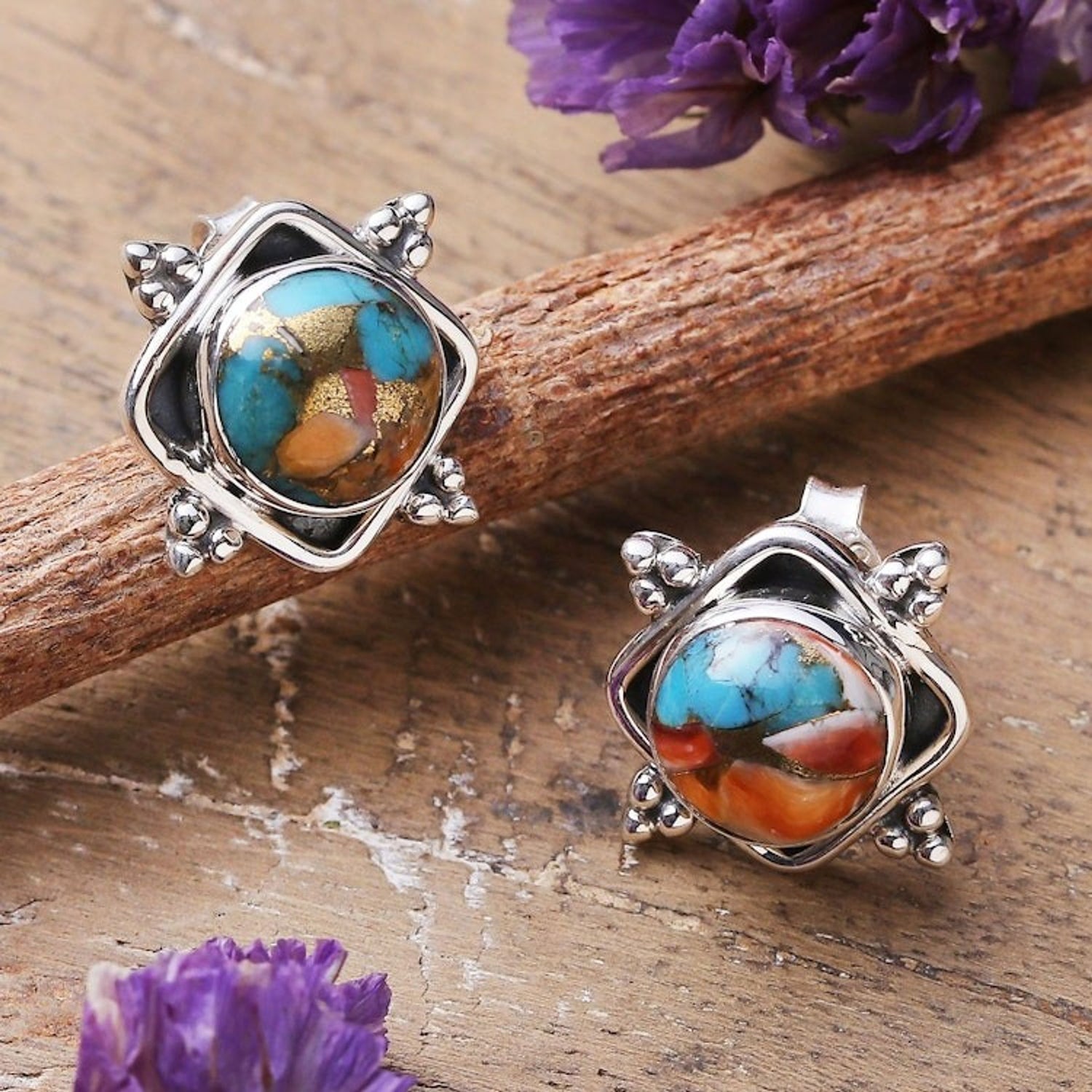 Handcrafted in India with .925 sterling silver and reconstituted turquoise. Each earring measures 0.5 inches in length and 0.5 inches in width. They have a combination finish. Colors may vary slightly.