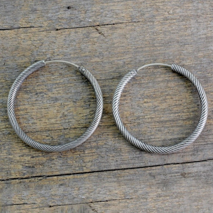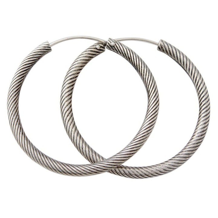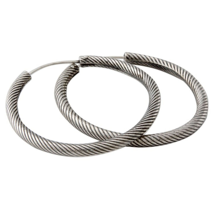 These Indian Twist Design Sterling Silver Endless Hoop Earrings 'Timeless Twist' are a classic and versatile accessory. Designed by Mahavir, these sterling silver hoop earrings feature a lightly-oxidized spiraling twist pattern. The pieces, which unite tradition and modernity, are a beautiful representation of the artisan's passion for creativity and his dedication to his craft.