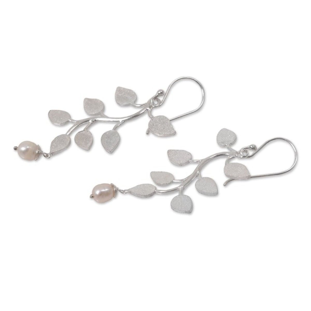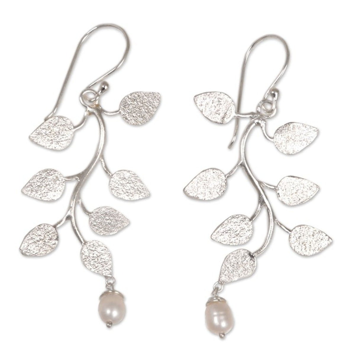 These Indonesian Sterling Silver Cultured Pearl Dangle Earrings 'White Forest' are a delicate and luminous accessory. Designed by Nyoman Rena, these earrings feature textured sterling silver leaves that culminate in luminous white cultured pearls. The pieces, which capture both Balinese heritage and contemporary design, are a beautiful representation of the artisan's dedication to growth and innovation.