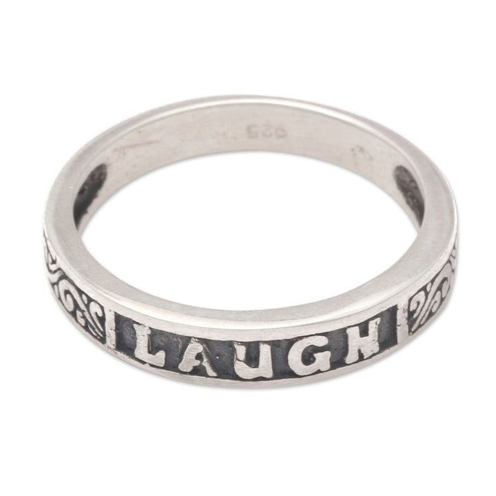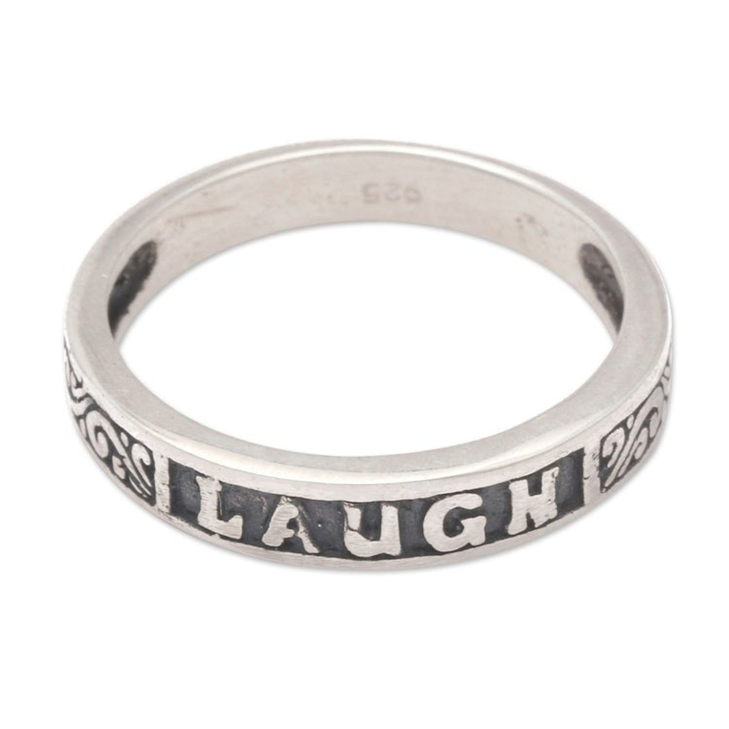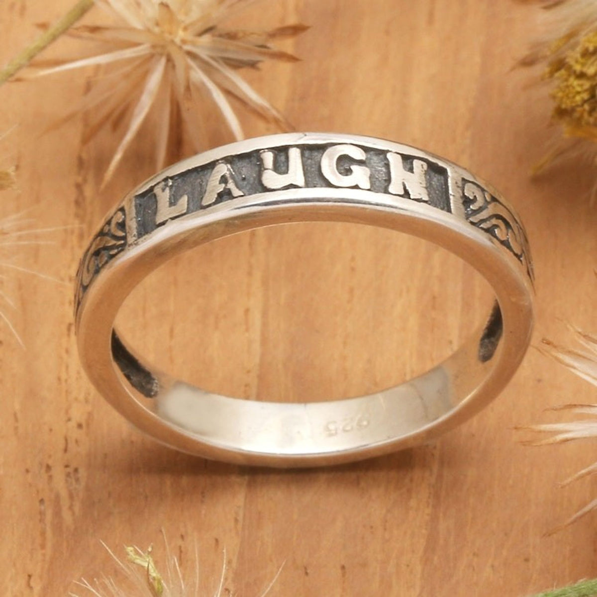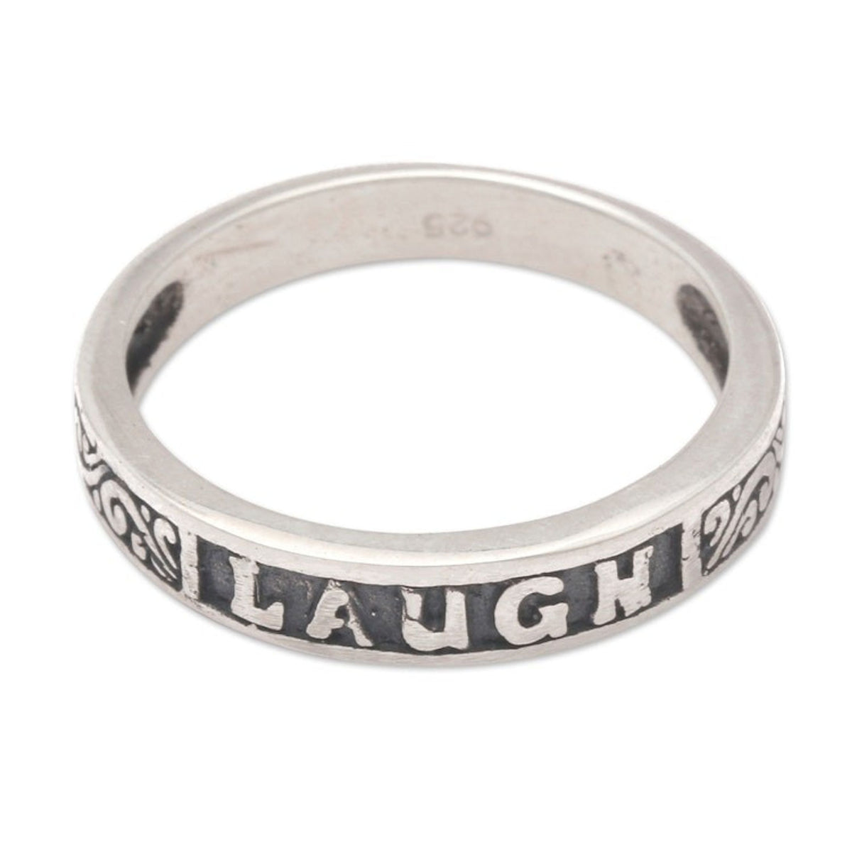 Inspirational Sterling Silver Band Ring with Darkened Accent 'Laugh'