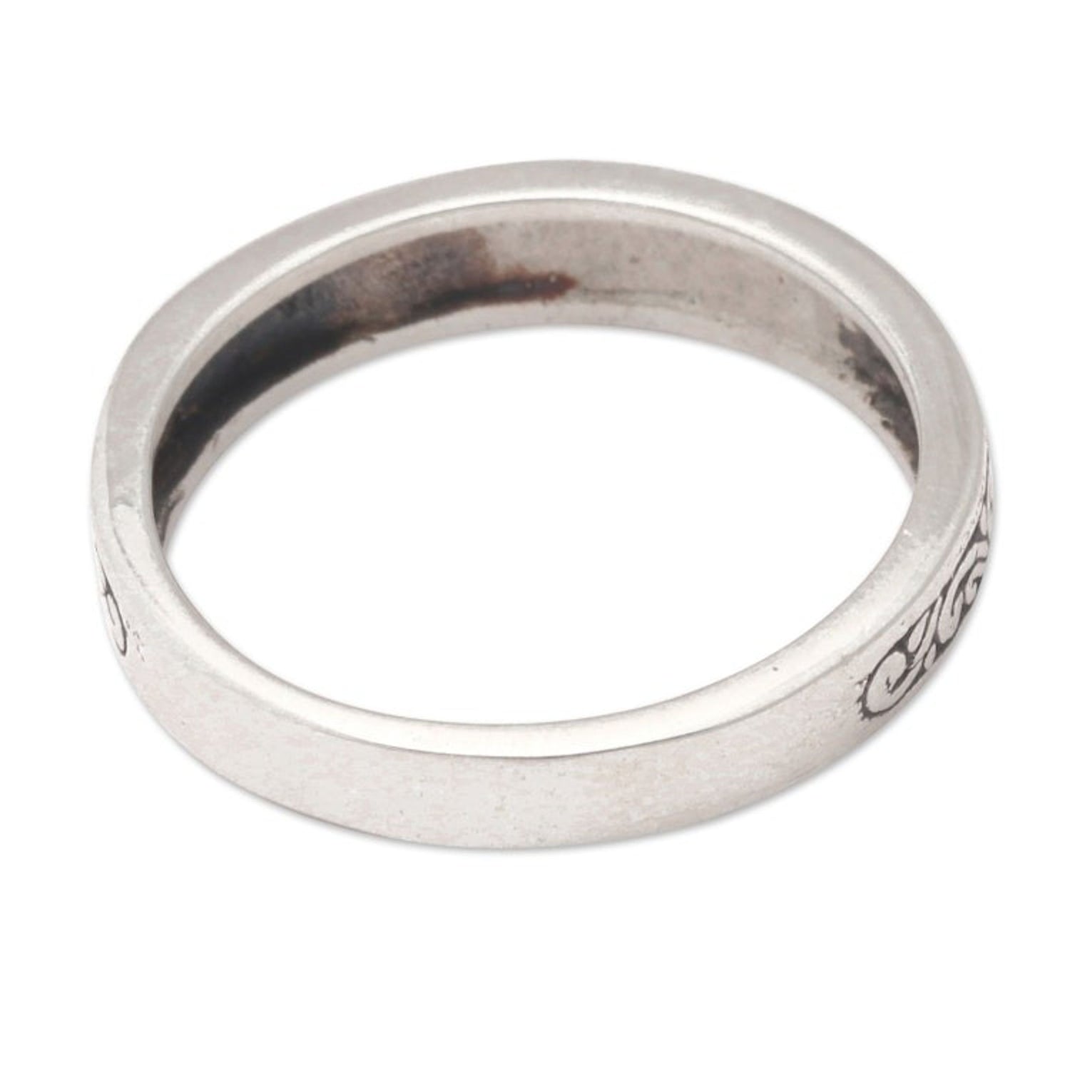 This Inspirational Sterling Silver Band Ring with Darkened Accent 'Laugh' is a splendid and motivational accessory. Designed by Nyoman Rena, this sterling silver band ring is exquisitely engraved with the word 'Laugh' and flanked by intricate swirl patterns. The piece, which captures both Balinese heritage and contemporary design, is a beautiful representation of the artisan's dedication to growth and innovation.