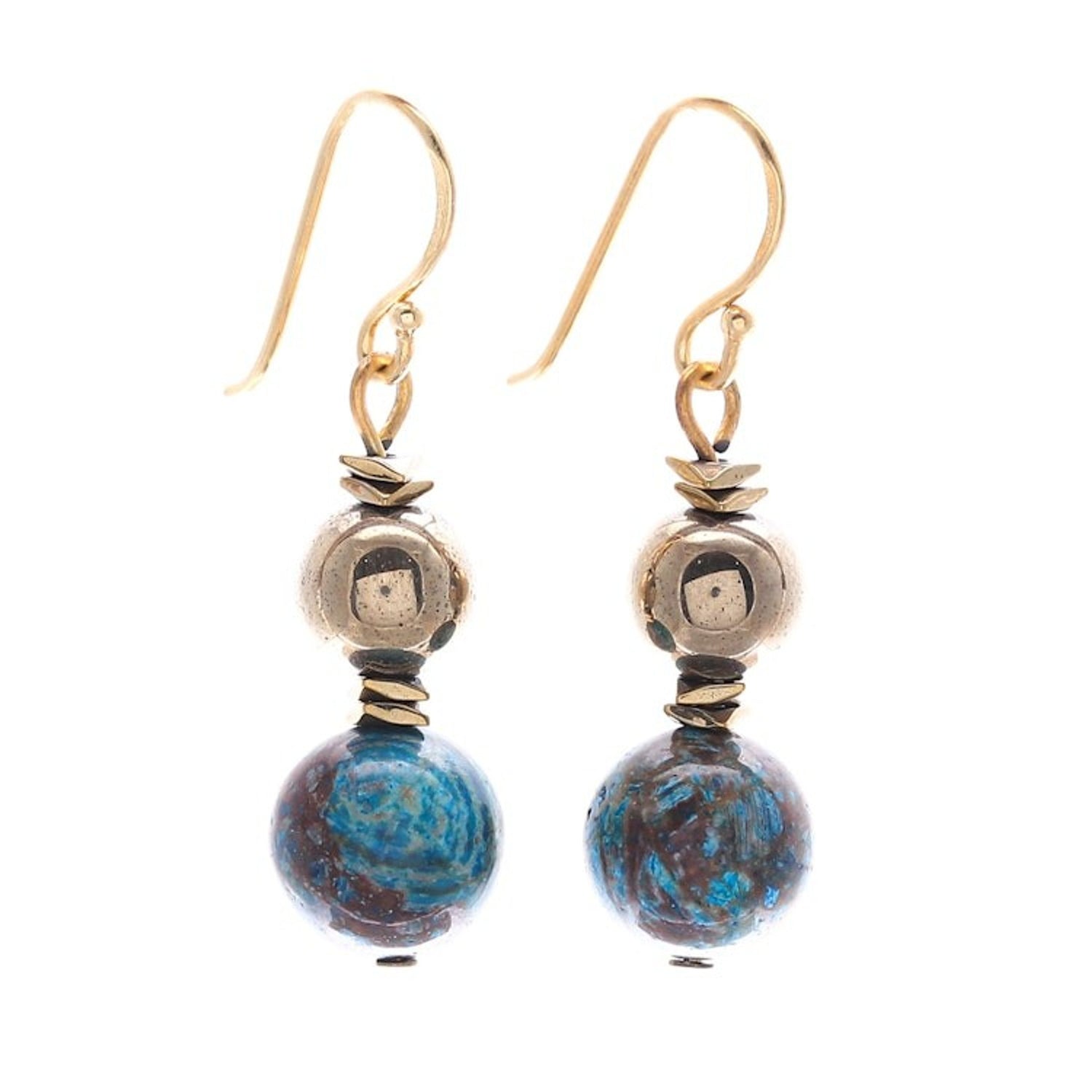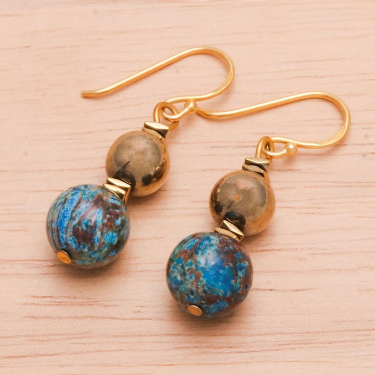 These Jasper and Hematite Dangle Earrings with Gold Accented Hooks 'Golden Planet' are a breathtaking and elegant accessory. Designed by Tipa, these dangle earrings feature jasper and hematite gems with 24K gold-plated sterling silver hooks. The pieces, which blend Thai heritage with worldly influences, are a beautiful representation of the artisan's cultural pride and family collaboration.