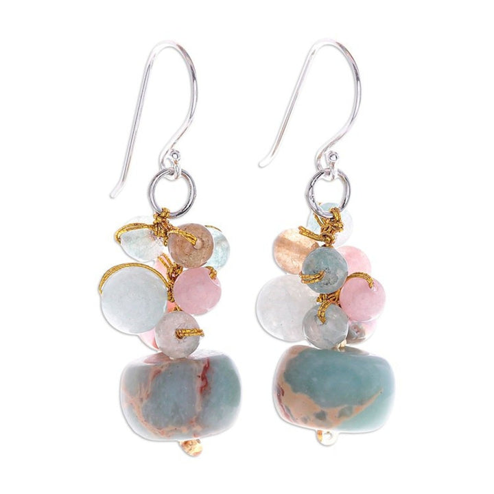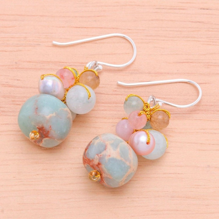 These Jasper Cultured Pearl and Quartz Beaded and Hooked Earrings 'Cave Treasures' are an ethereal and beautifully colored accessory. Designed by Nareerat, these beaded earrings feature jasper, cultured freshwater pearls, and quartz suspended from sterling silver hooks. The pieces, which are a celebration of skill and heritage, are a beautiful representation of the artisan's commitment to community empowerment.