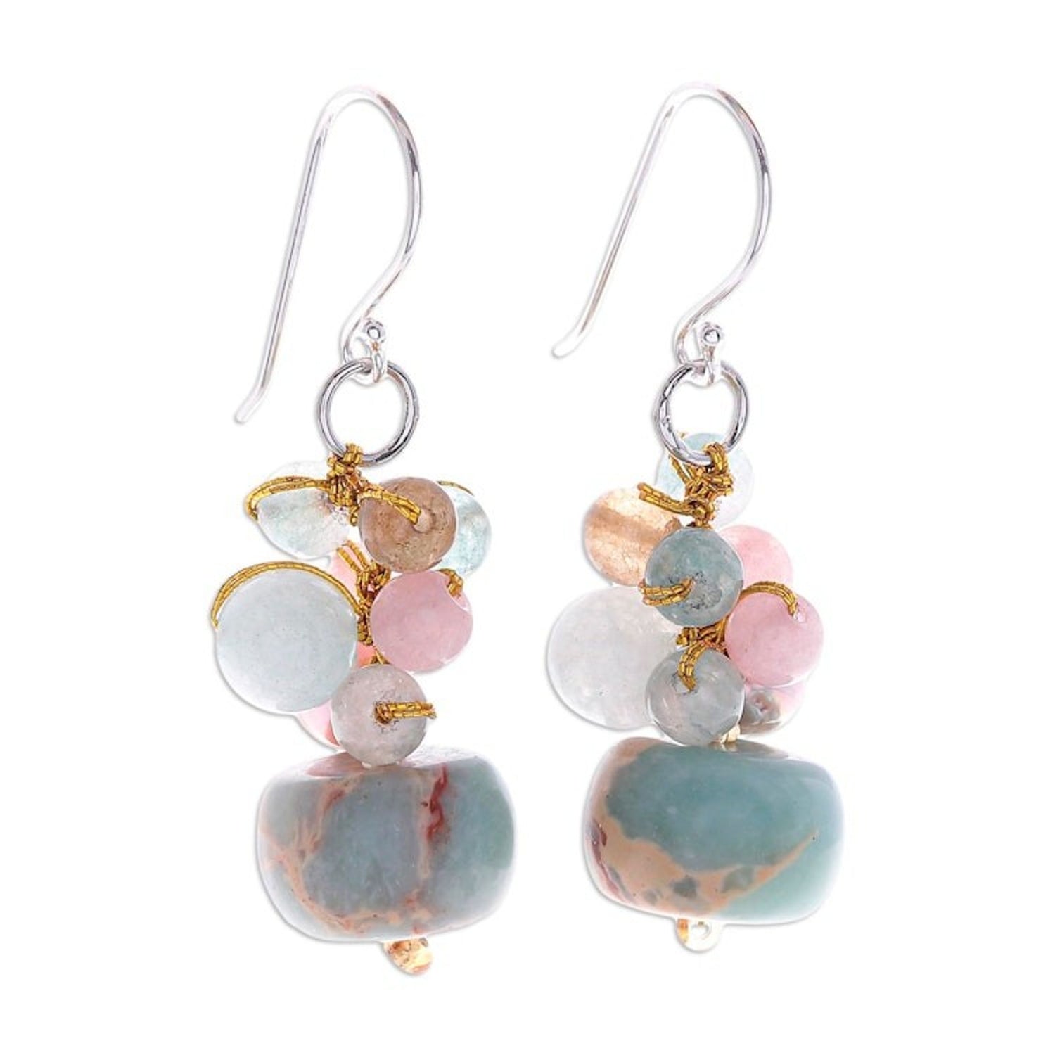 Handcrafted in Thailand with jasper, cultured freshwater pearl, quartz, and .925 silver hooks with metallic thread. Each earring measures 1.4 inches in length and 0.5 inches in width. Natural variations in color and pattern are to be expected. They have a high-polish finish.