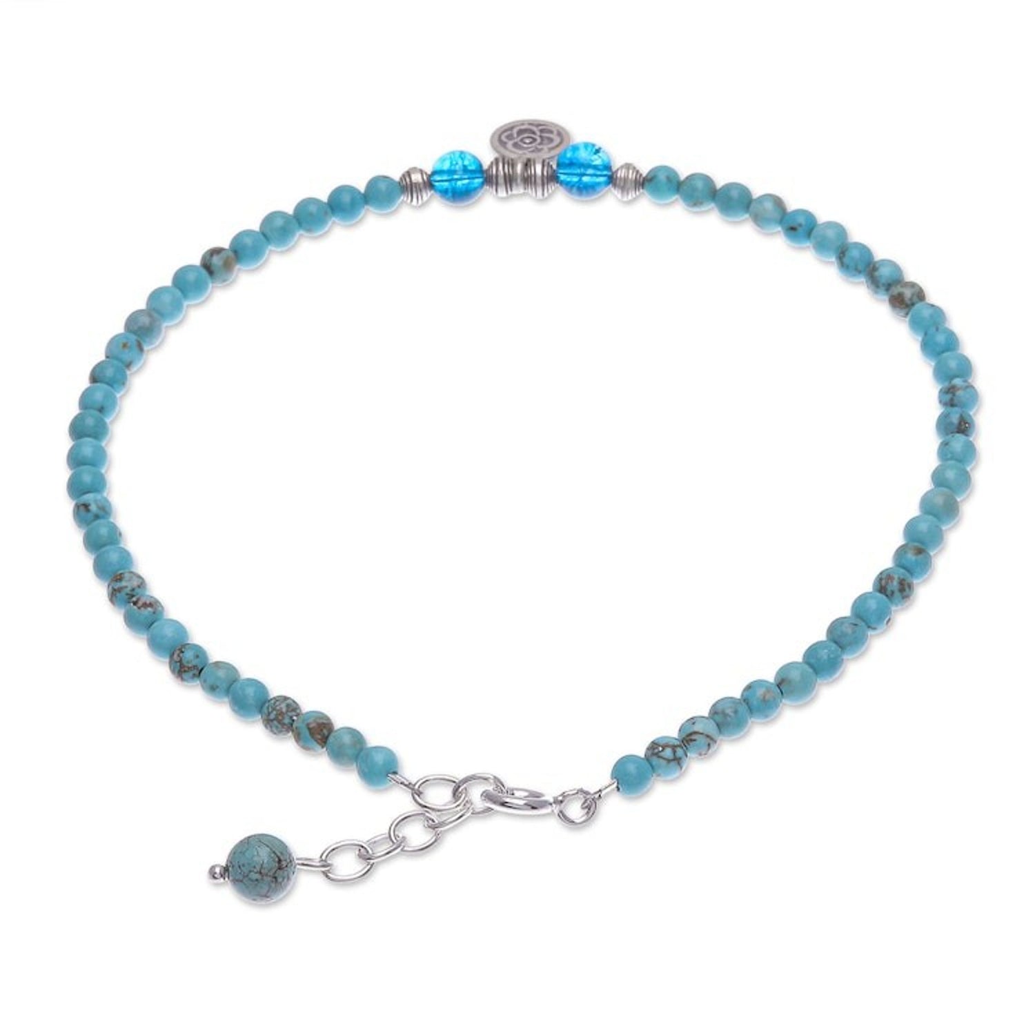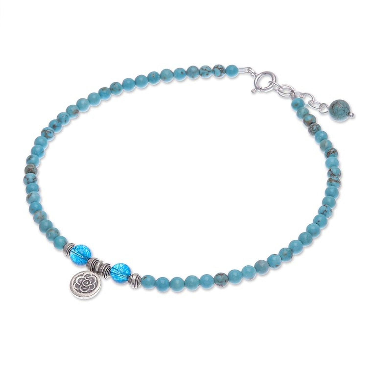 Handcrafted in Thailand with 950 Karen silver, .925 sterling silver clasp, dyed quartz, and reconstituted turquoise. The anklet is 10.3 inches long with a 0.8-inch extender. The charm measures 0.3 inches in length and 0.3 inches in width. It has a combination finish. Colors may vary slightly.