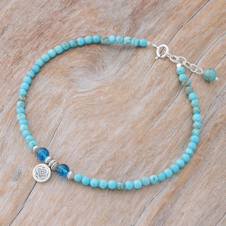 This Karen Silver and Quartz Charm Anklet 'Spring Step' is a delicate and beautiful accessory. Designed by Tipa, this anklet features a flower-stamped 950 silver charm with translucent blue quartz and smooth turquoise beads. The piece, which celebrates the artistry of silver, is a beautiful representation of the artisan's journey from a small town to international horizons.