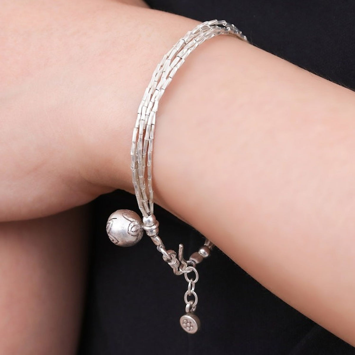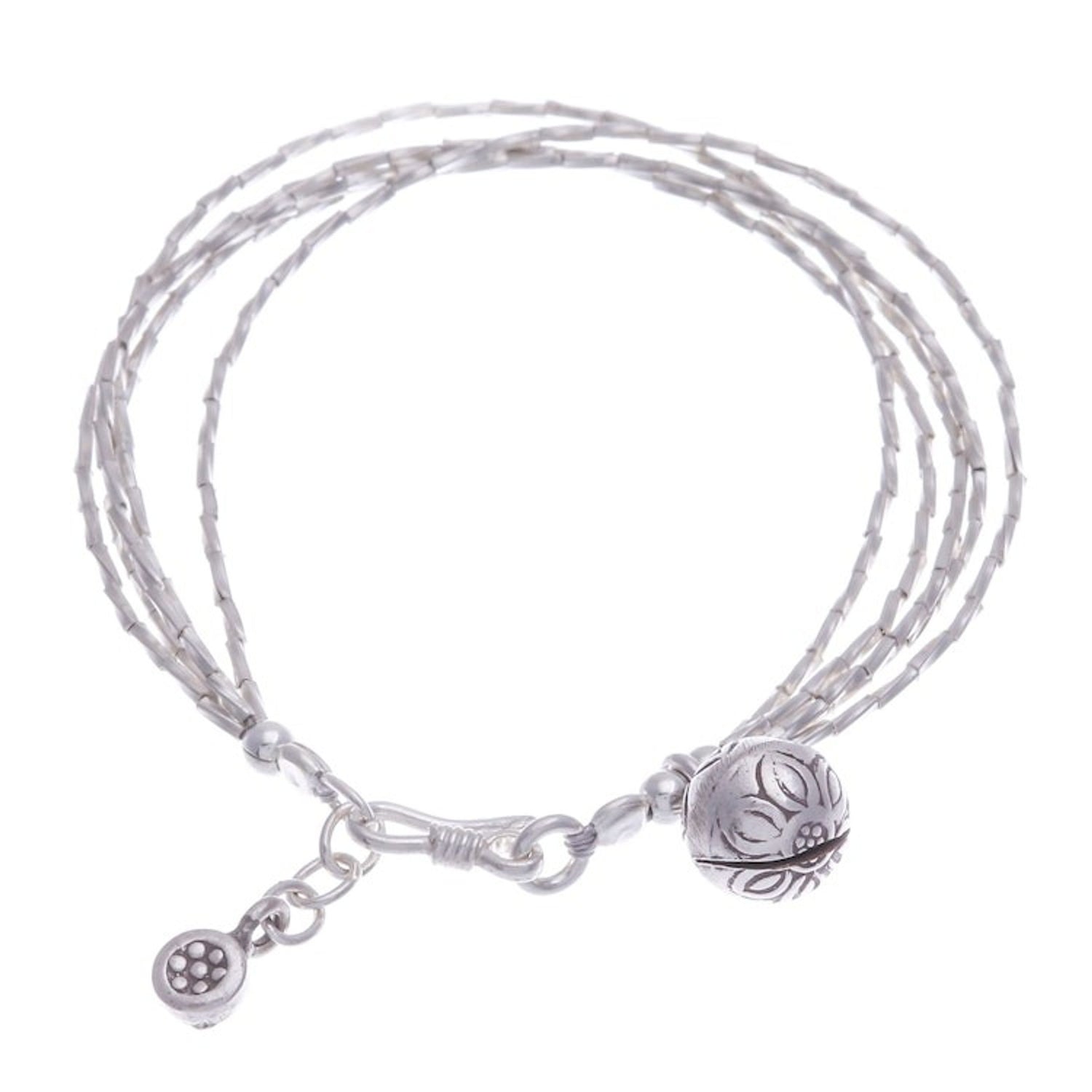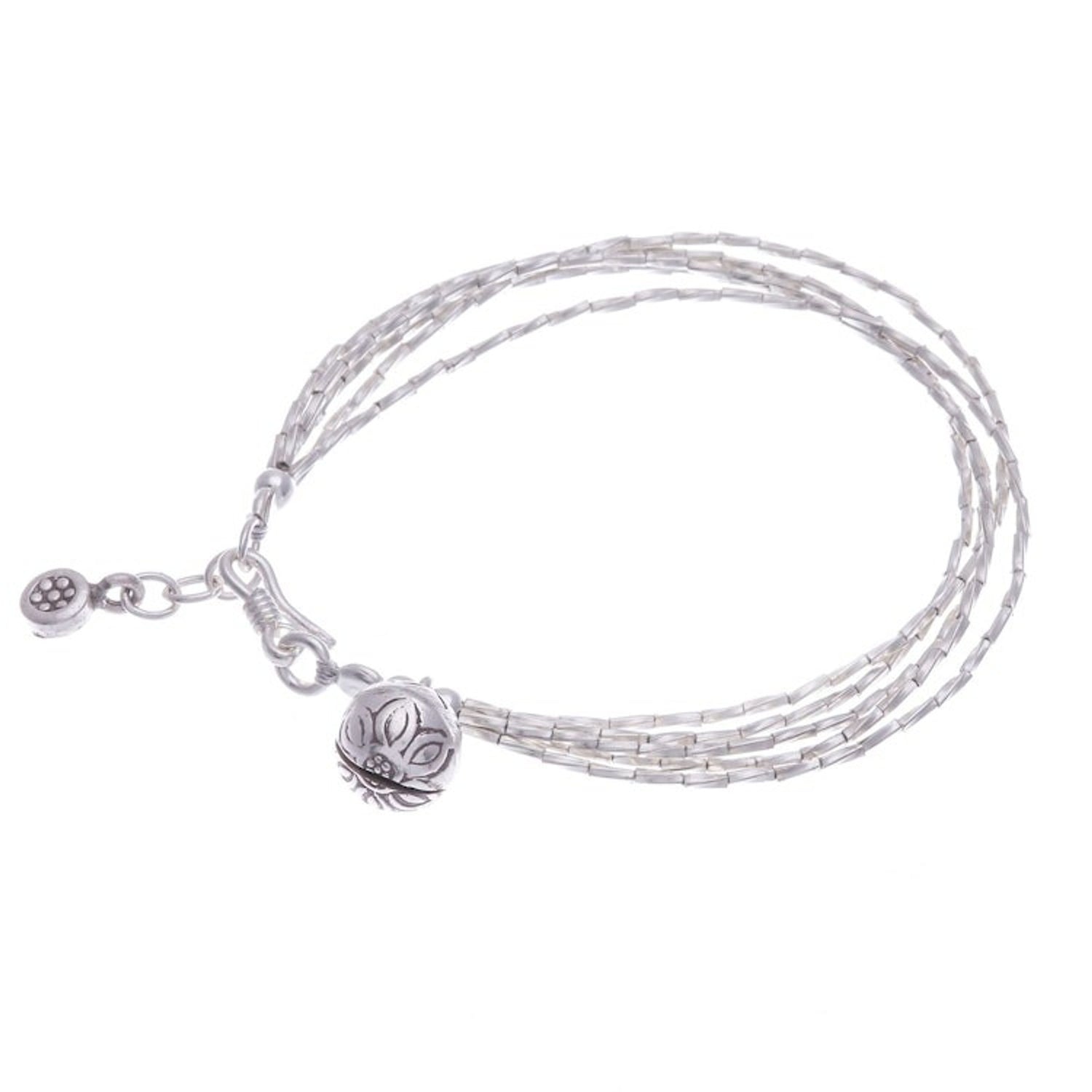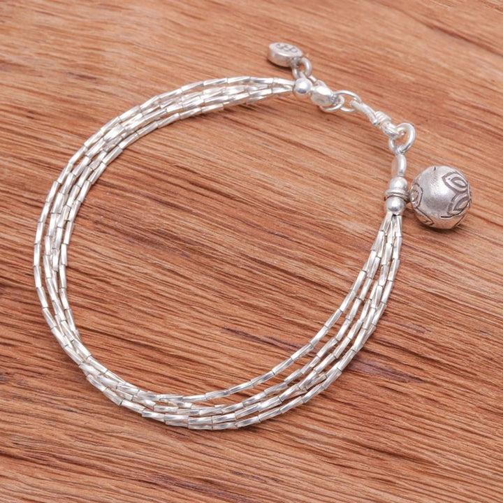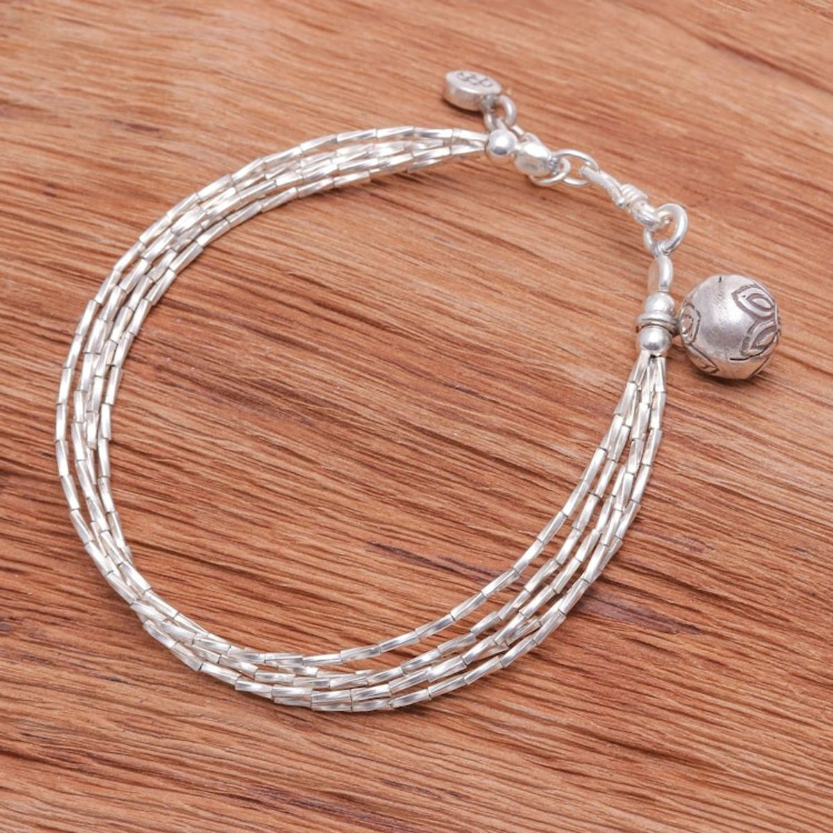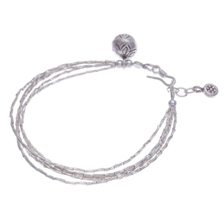 This Karen Silver Beaded Bracelet from Thailand 'Karen Rivers' is a stylish and charming accessory. Designed by Siranya, this bracelet features four beaded strands of 950 silver and is completed with a hammered silver ball and a petite stamped charm from Karen hill tribe artisans. The piece, which is shaped by imagination and storytelling, is a beautiful representation of the artisan's creative spirit and lived experience.