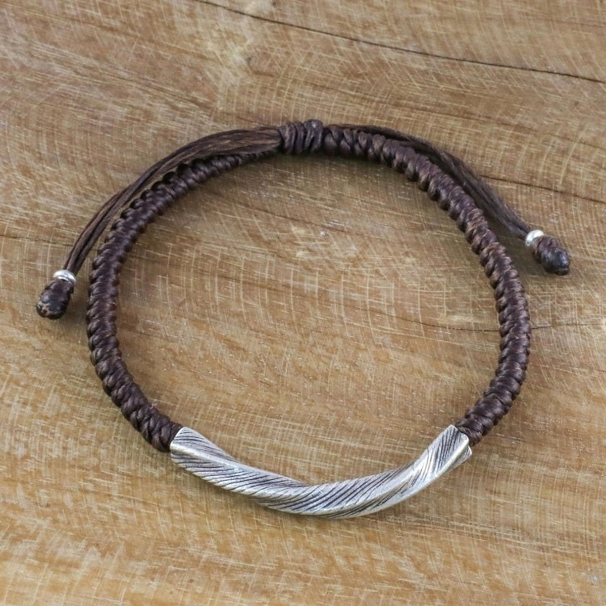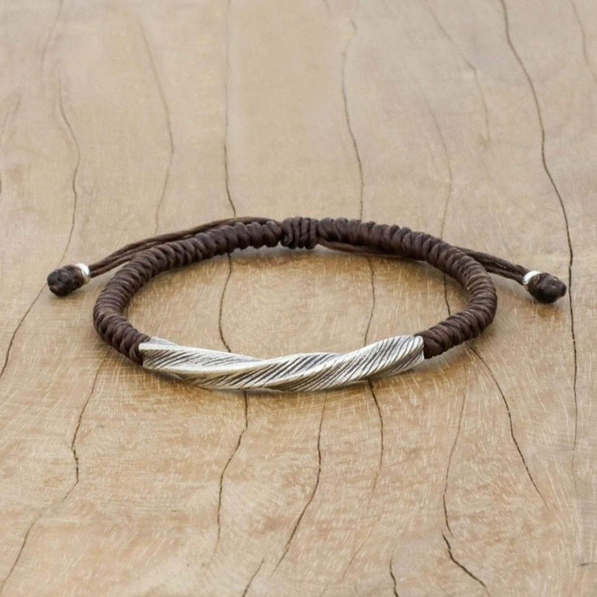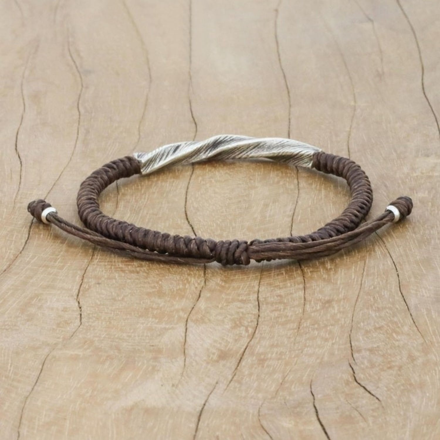 This Karen Silver Wristband Bracelet in Brown from Thailand 'Karen Twist in Brown' is a striking and elegant accessory. Designed by Napapat, this wristband bracelet features a striking, twisting pendant handcrafted of Karen hill tribe silver on a hand-braided brown cord. The piece, which blends ethnic Thai influences with modern durability, is a beautiful representation of the artisan's patience, imagination, and heartfelt artistry.