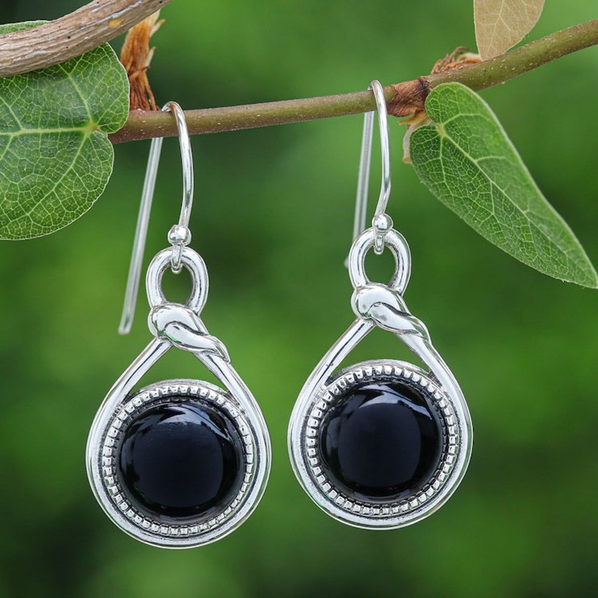 These Knot Pattern Black Onyx Dangle Earrings from Thailand 'Enigmatic Knot' are a refined and luxurious accessory. Designed by Michael Krainer, these dangle earrings feature knot patterns of refined loops crafted from sterling silver, and are crowned with black onyx cabochons. The pieces, which combine tradition with innovation, are a beautiful representation of the artisans' commitment to creating jewelry with artistry and soul.