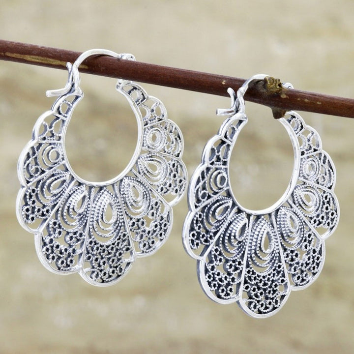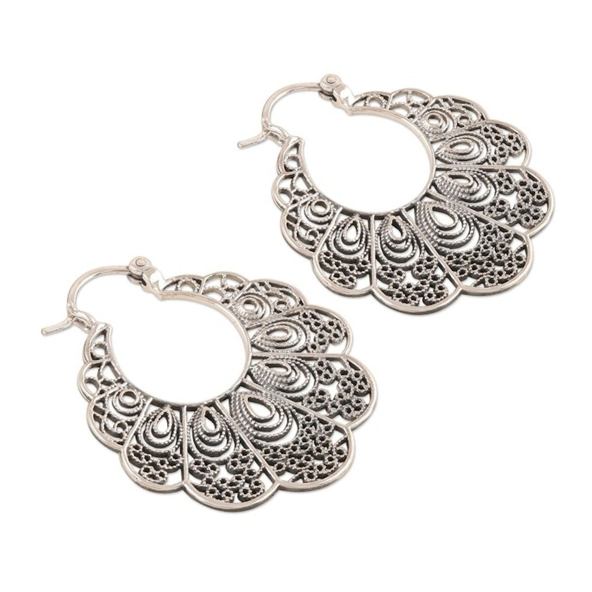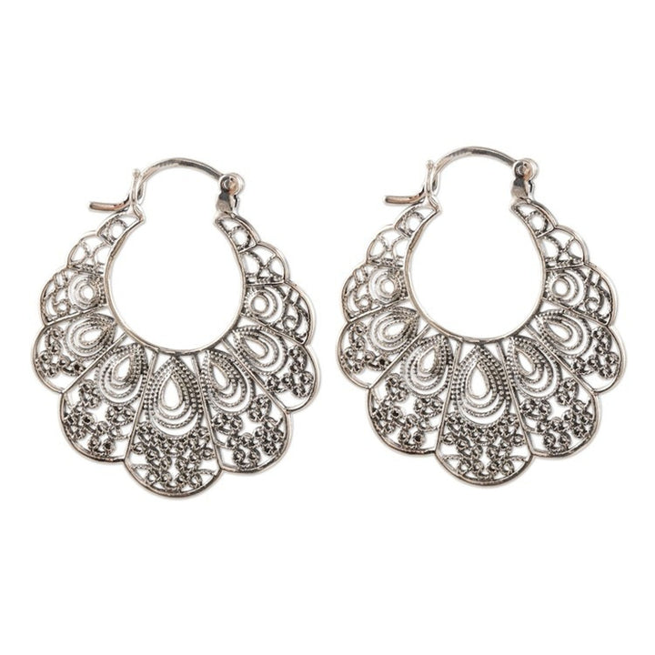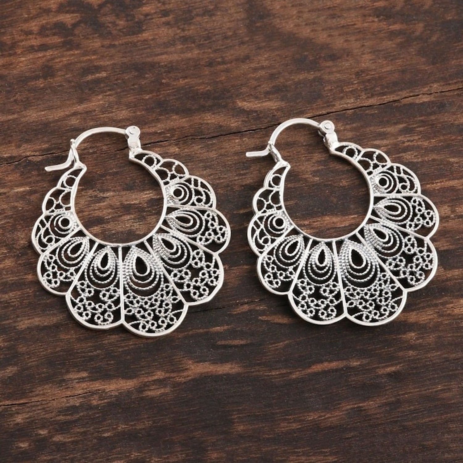 These Lacy Filigree Sterling Silver Hoop Earrings 'Sweet Frills' are a delicate and lacy accessory. Designed by Neetu Barathi, these hoop earrings are crafted of sterling silver and feature delicate wirework within their scalloped forms. The pieces, which blend tradition and modernity, are a beautiful representation of the artisan's personal dream and her hope of reaching ever greater heights in her career.