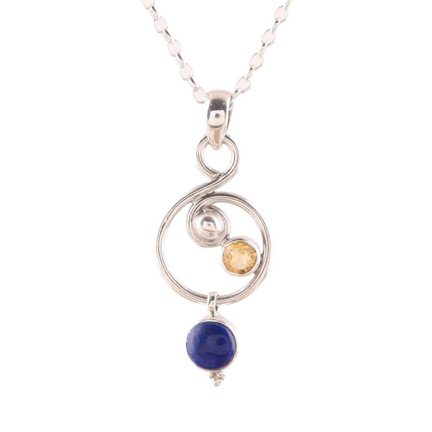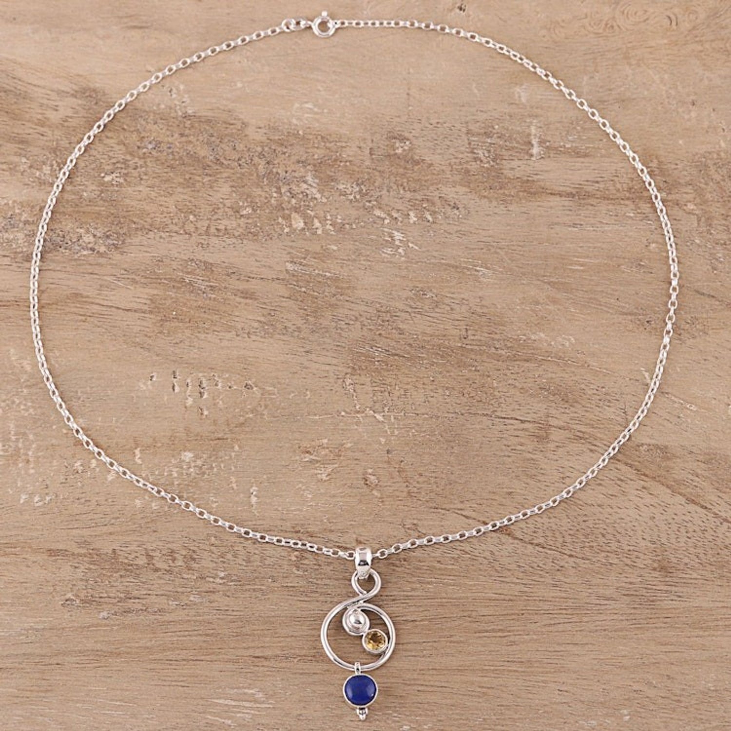 This Lapis Lazuli and Citrine Necklace Crafted in India 'Swirling Royal' is a royal and beautiful accessory. Designed by Shanker, this pendant necklace features a sterling silver pendant with swirling patterns, combining the beauty of faceted citrine with deep blue lapis lazuli that dangles below. The piece, which represents perseverance, tradition, and passion, is a beautiful representation of the artisan's commitment to quality and originality.