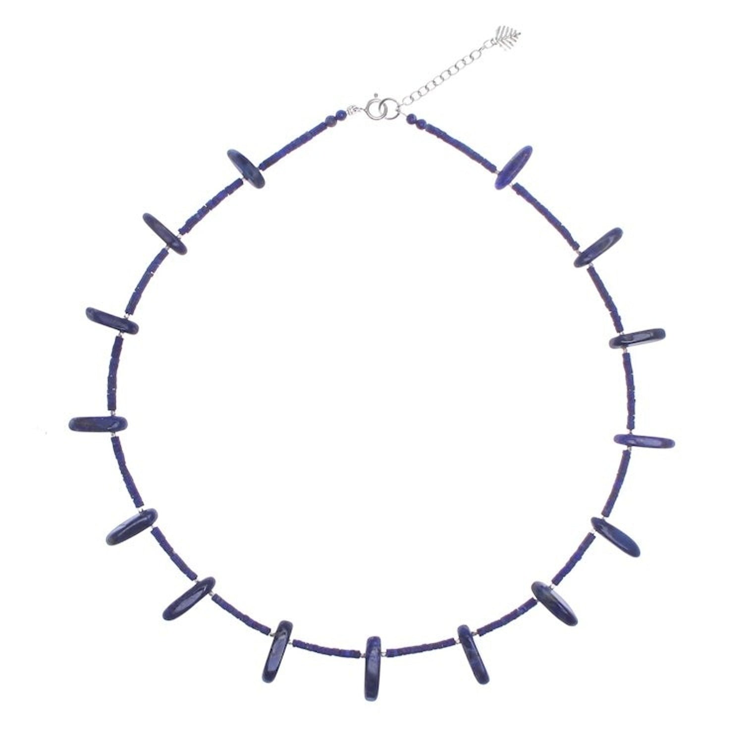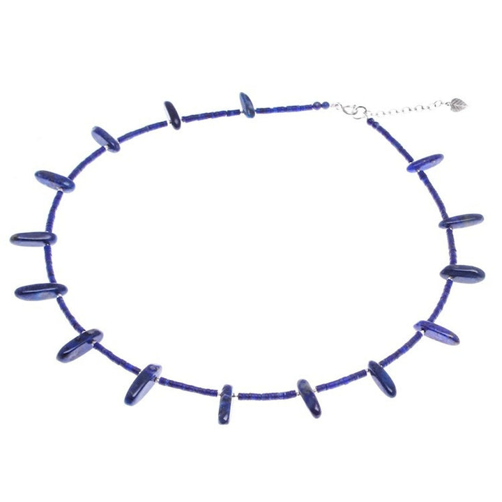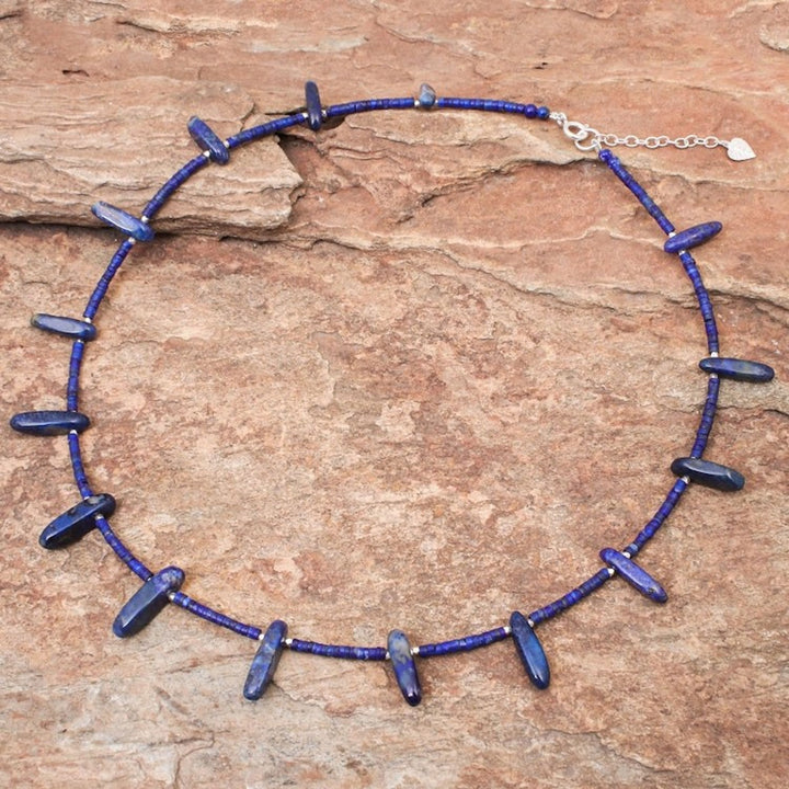 This Lapis Lazuli and Karen Hill Tribe Silver Beaded Necklace 'True Blue at Midnight' is a vivid and elegant accessory. Designed by Somluck Komolmith, this beaded necklace intersperses tiny flat lapis lazuli beads with larger cylindrical lapis beads, accented by 950 Karen silver beads. The piece, which embodies originality and care, is a beautiful representation of the artisan's commitment to offering women timeless designs.