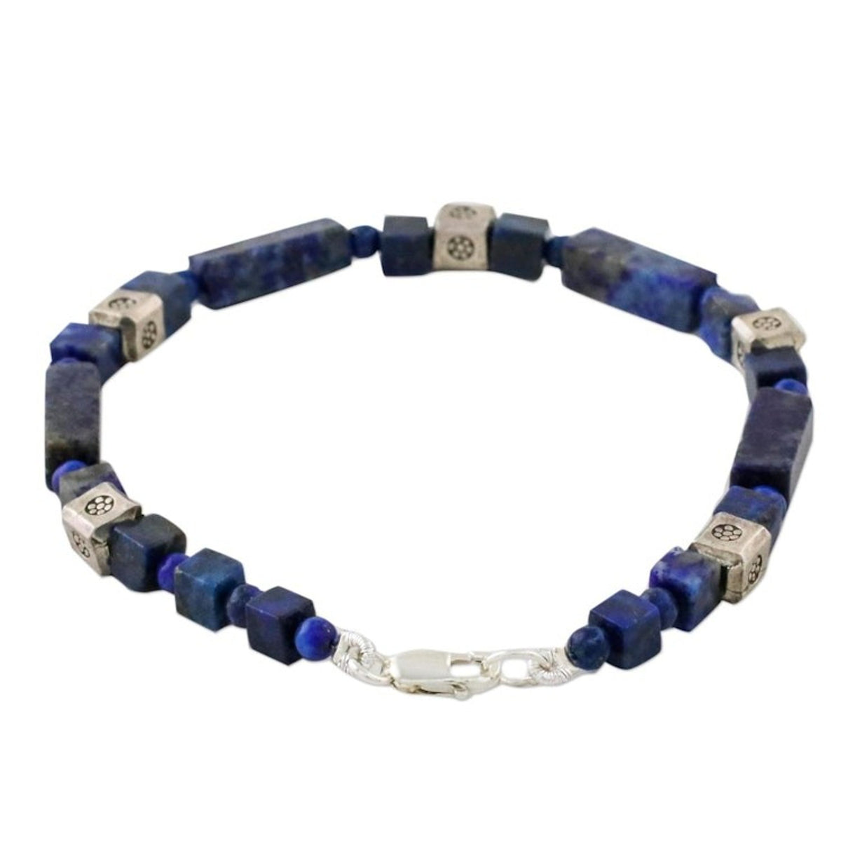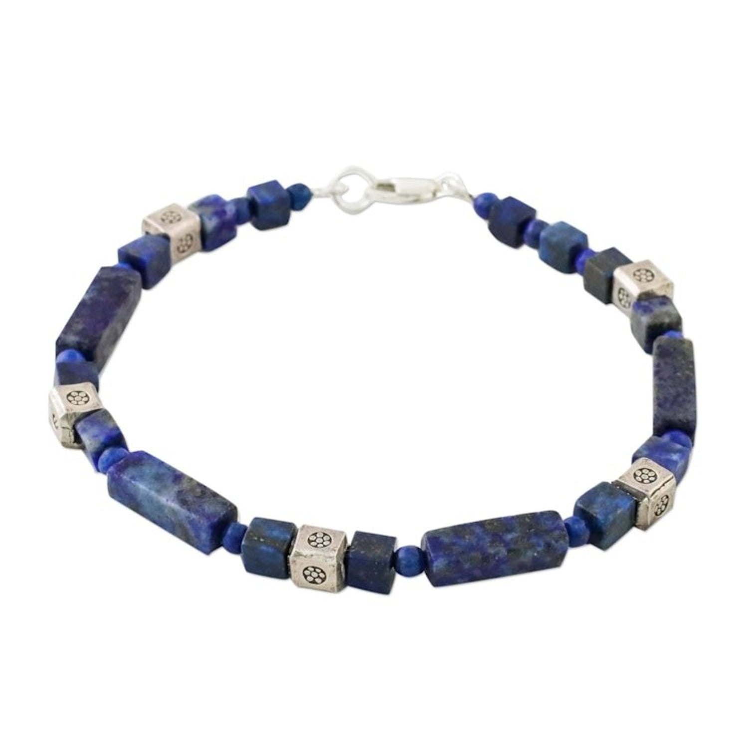 Handcrafted in Thailand with 950 silver beads, dyed lapis lazuli, and a .925 sterling silver clasp. The bracelet is 7 inches long and 4 mm wide. It has a combination finish. Colors may vary slightly.