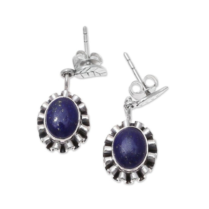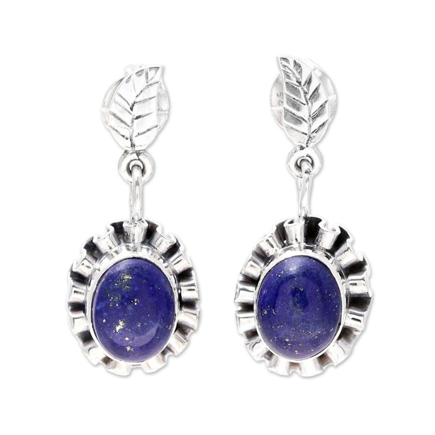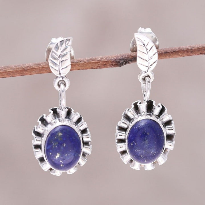 These Lapis Lazuli and Sterling Silver Flower Dangle Earrings 'Blue Ribbon Flower' are a stylish and lovely accessory. Designed by Aparna, these dangle earrings feature a lapis lazuli oval cabochon surrounded by a rippling ribbon of sterling silver to create a stylish flower. The pieces, which reflect the heritage of Jaipur, are a beautiful representation of the artisan's commitment to carrying forward her family’s creative spirit.