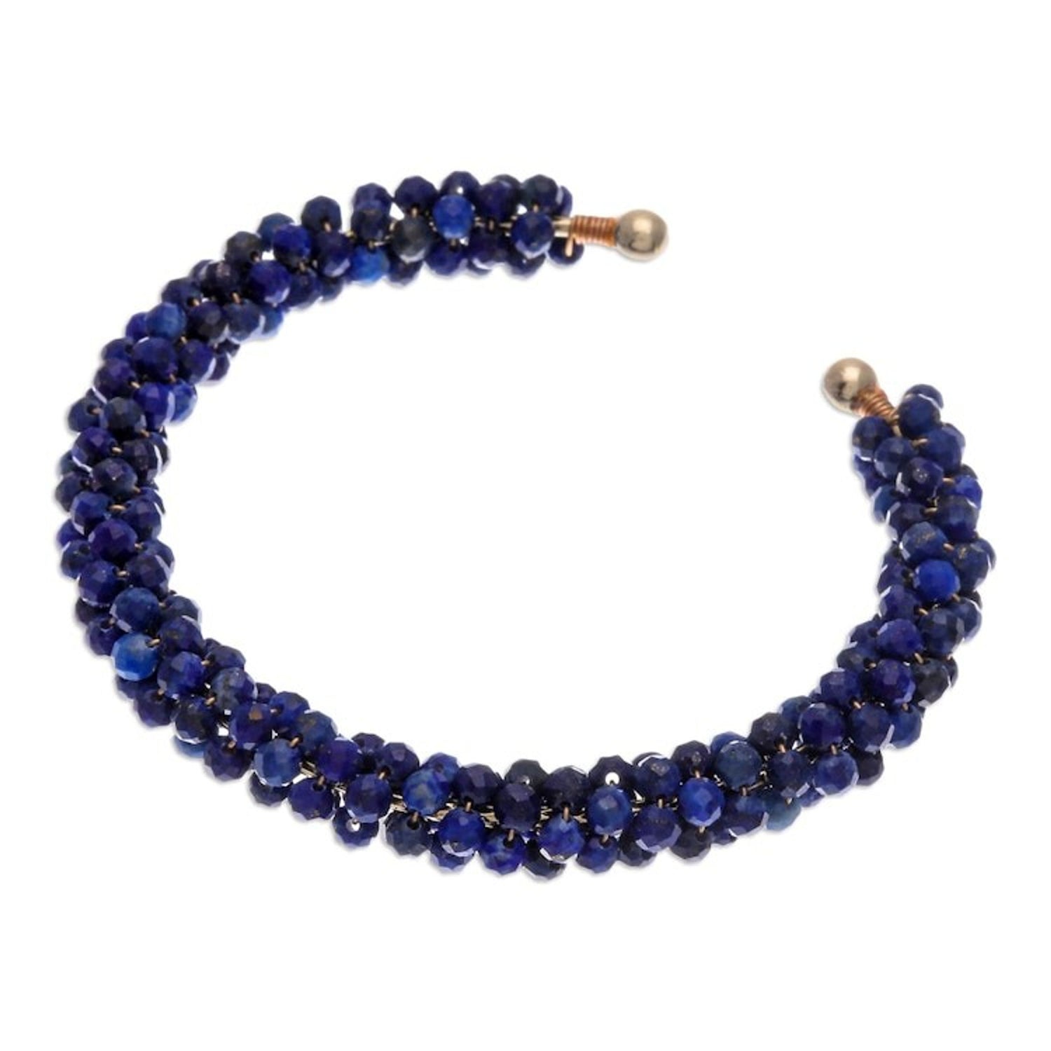 This Lapis Lazuli Beaded Cuff Bracelet with Brass Fixtures 'Captivating Beauty' is an awe-inspiring and sophisticated accessory. Designed by Nareerat, this cuff bracelet is adorned with gorgeous lapis lazuli stones, skillfully arranged with copper wires, and complemented by brass fixtures. The piece, which is a celebration of skill and heritage, is a beautiful representation of the artisan's mission to keep the art of handmade jewelry alive.
