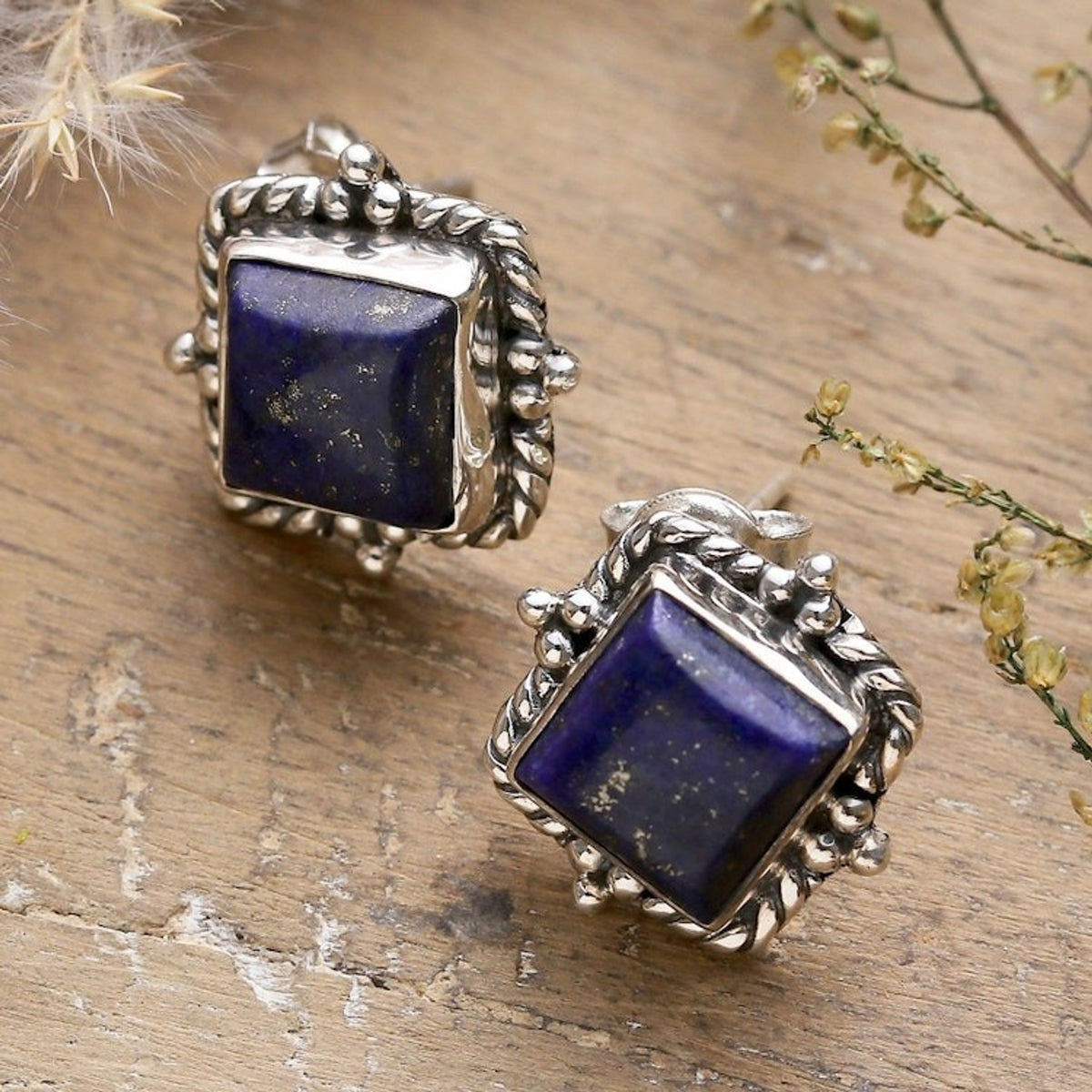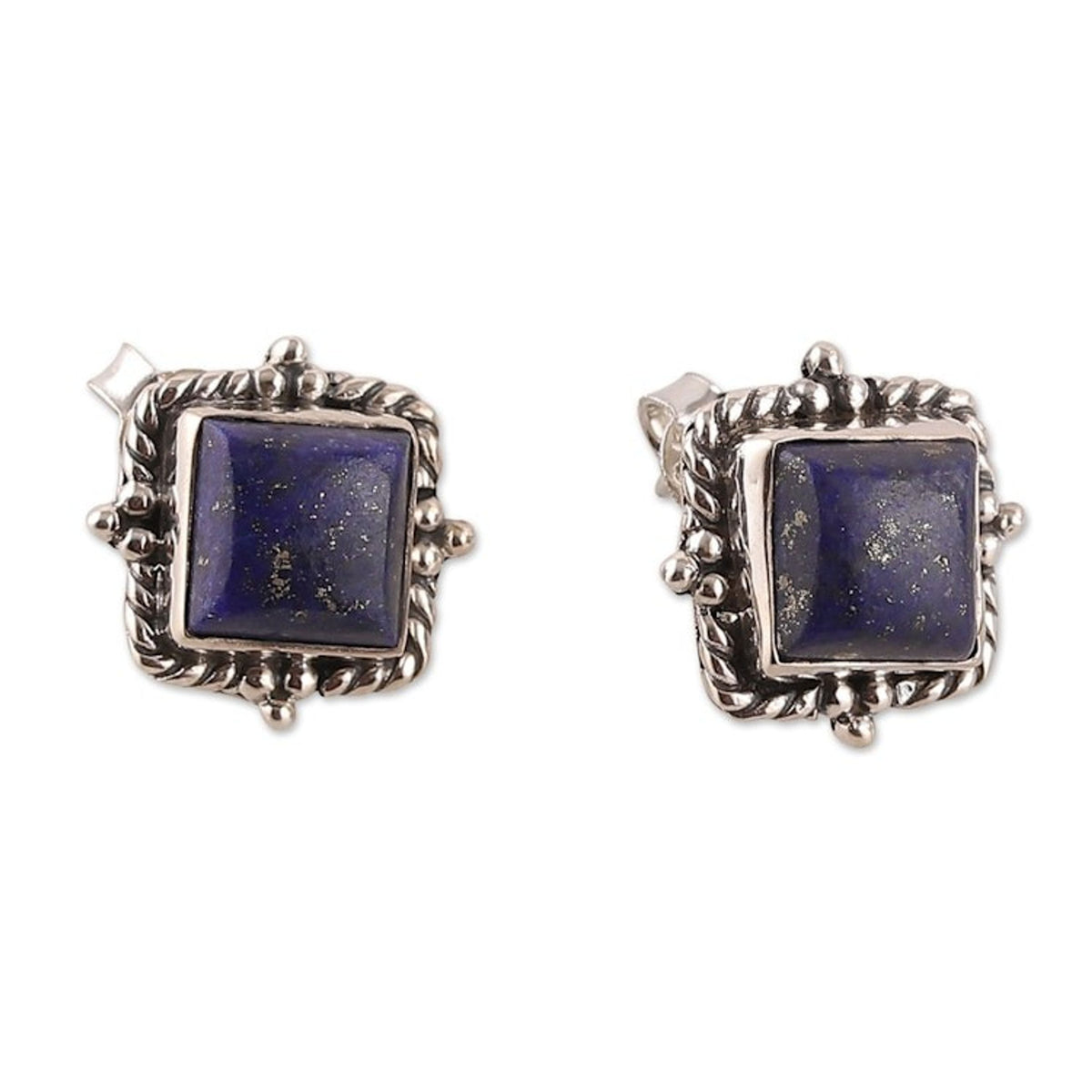 Handcrafted in India with .925 sterling silver and lapis lazuli. Each earring measures 0.6 inches in length and 0.6 inches in width. It has a combination finish. Colors may vary slightly.