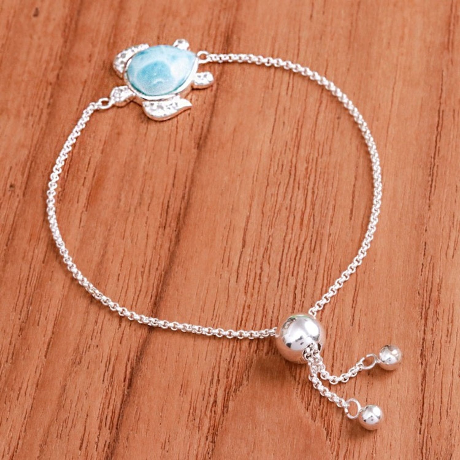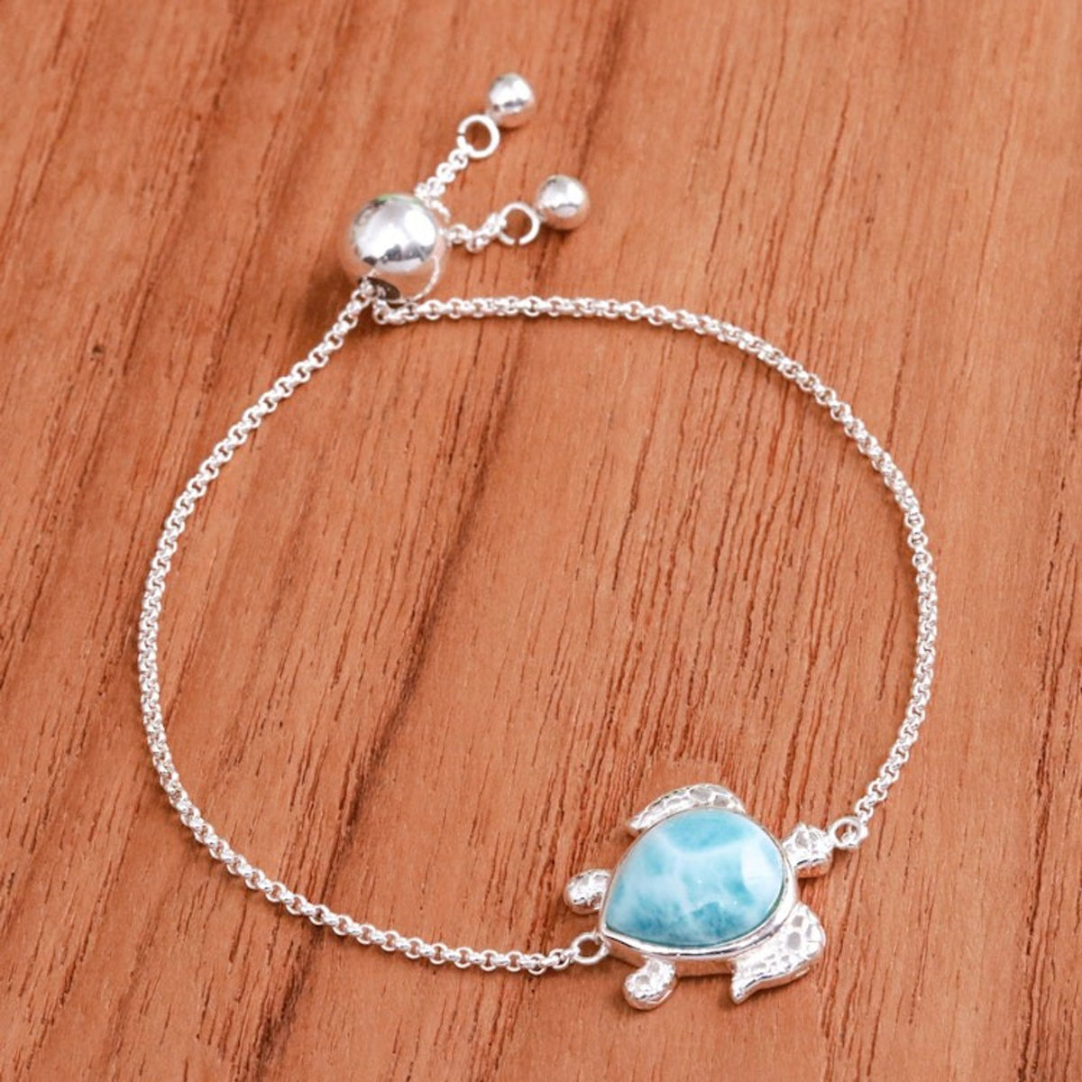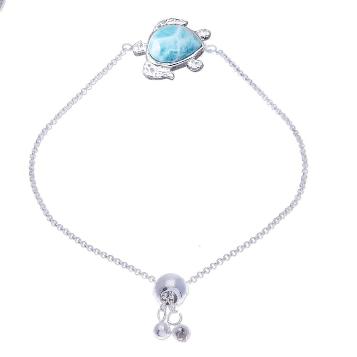 Handcrafted in Thailand with .925 sterling silver and larimar. The bracelet is adjustable from 6.8 to 7.5 inches. The pendant measures 0.7 inches in length and 0.8 inches in width. It has a combination finish. Natural variations in color and pattern are to be expected.