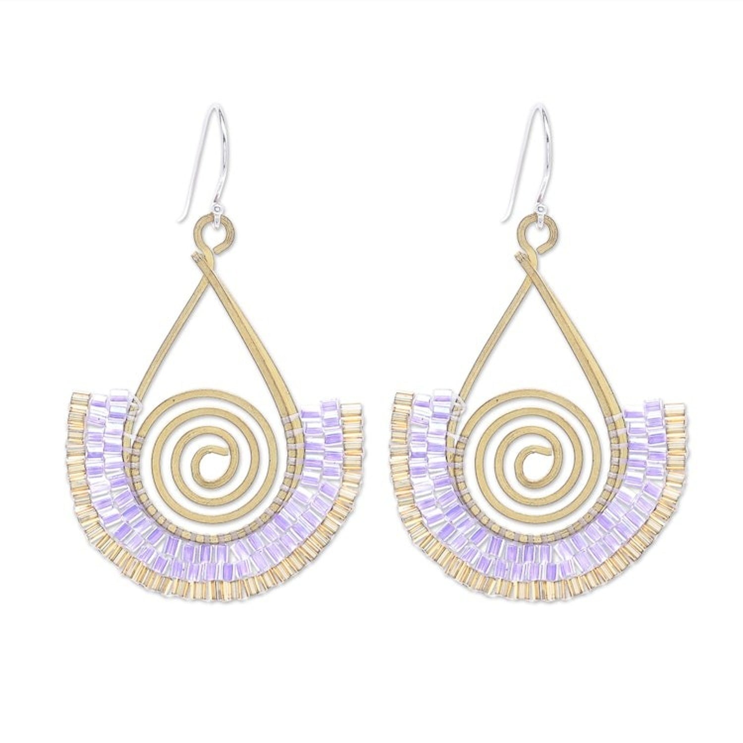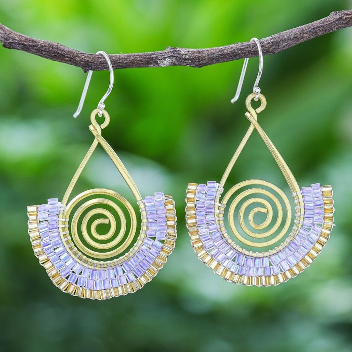 These Lavender and Gold Glass Bead Spiral Dangle Earrings 'Spiral Fan in Lavender' are a fan-shaped and radiant accessory. Designed by Nareerat, these dangle earrings feature tightly wound spirals of bright brass wire outlined with three rows of tubular glass beads in iridescent lavender and metallic gold. The pieces, which are a celebration of skill and heritage, are a beautiful representation of the artisan's mission to keep the art of handmade jewelry alive.
