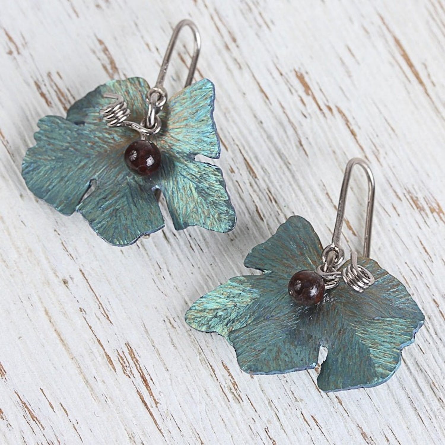 These Leaf Motif Agate Dangle Earrings from Mexico 'Vine' are a unique and handcrafted accessory. Designed by Diana Solis, these dangle earrings feature vine leaves formed from titanium-plated sterling silver, accentuated by sterling silver and agate beads. The pieces, which are rooted in cultural identity, are a beautiful representation of the artisan's mission to keep tradition alive.