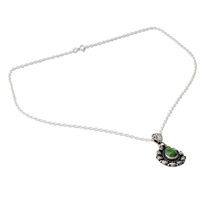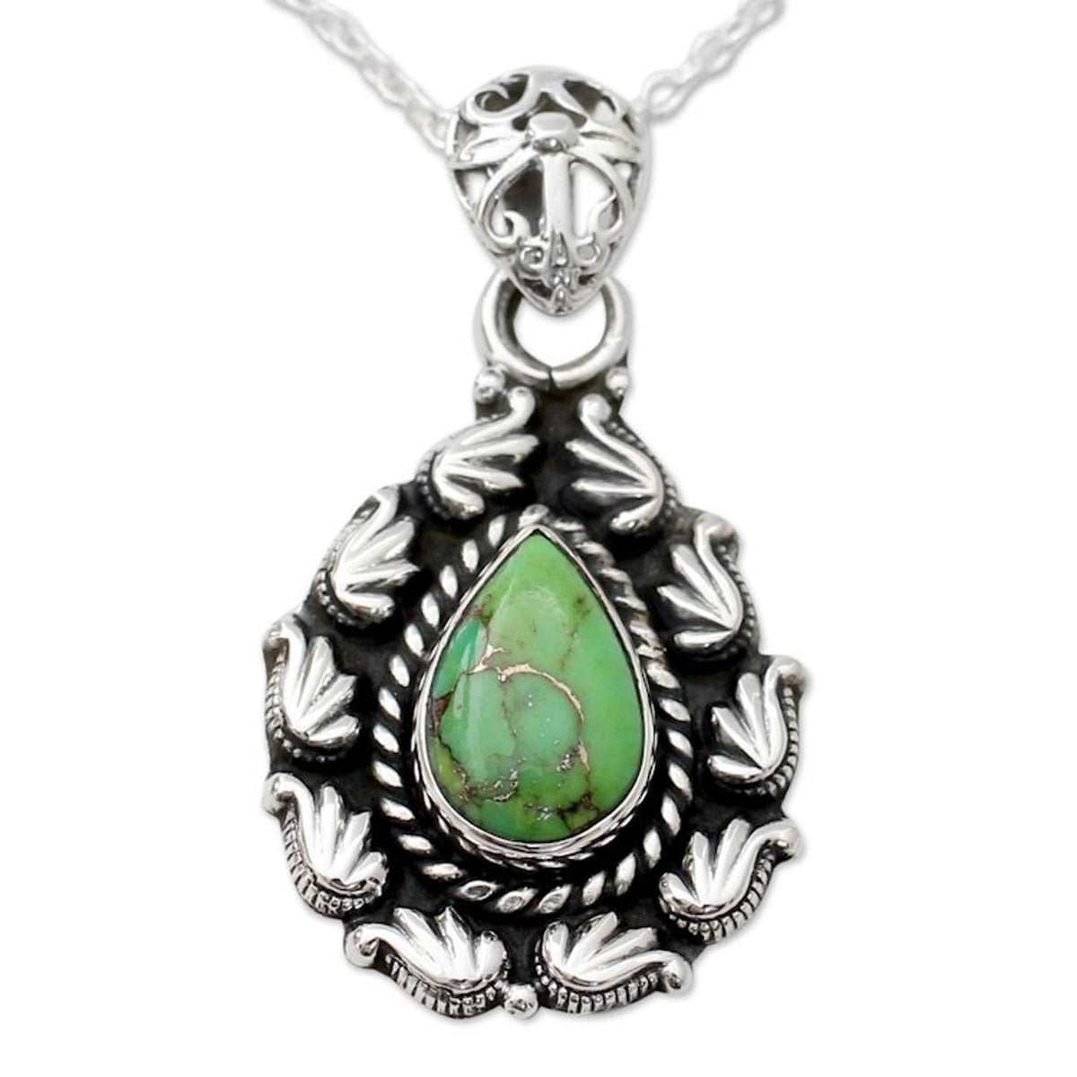 This Leaf Motif Silver Pendant Necklace with Composite Turquoise 'Grand Garland' is a captivating and intriguing accessory. Designed by Aparna, this pendant necklace features a garland of sterling silver leaves that surrounds a teardrop cabochon of intriguing green composite turquoise. The piece, which reflects the heritage of Jaipur, is a beautiful representation of the artisan's commitment to carrying forward her family's creative spirit.