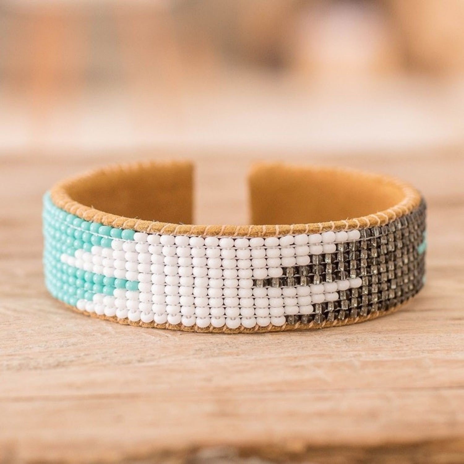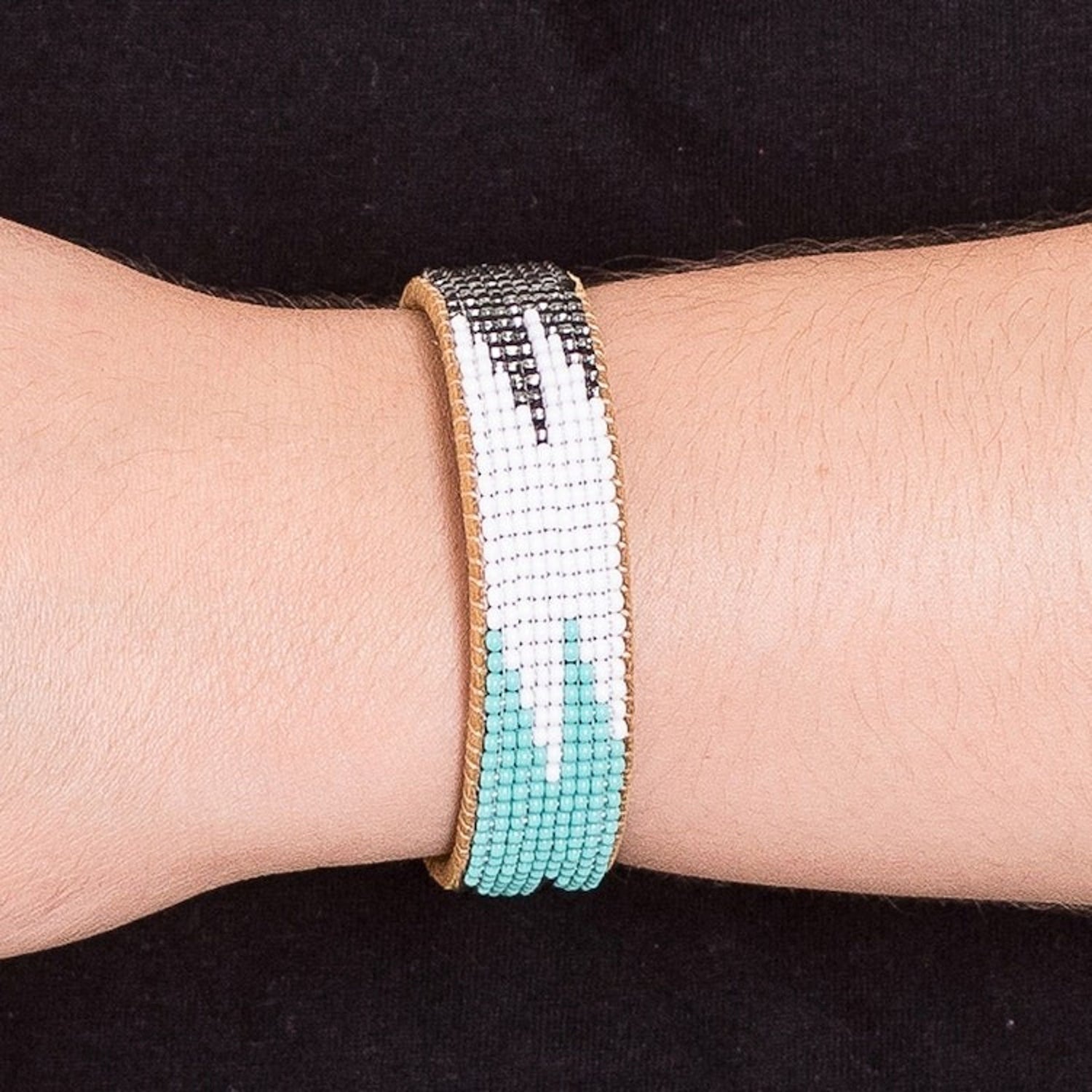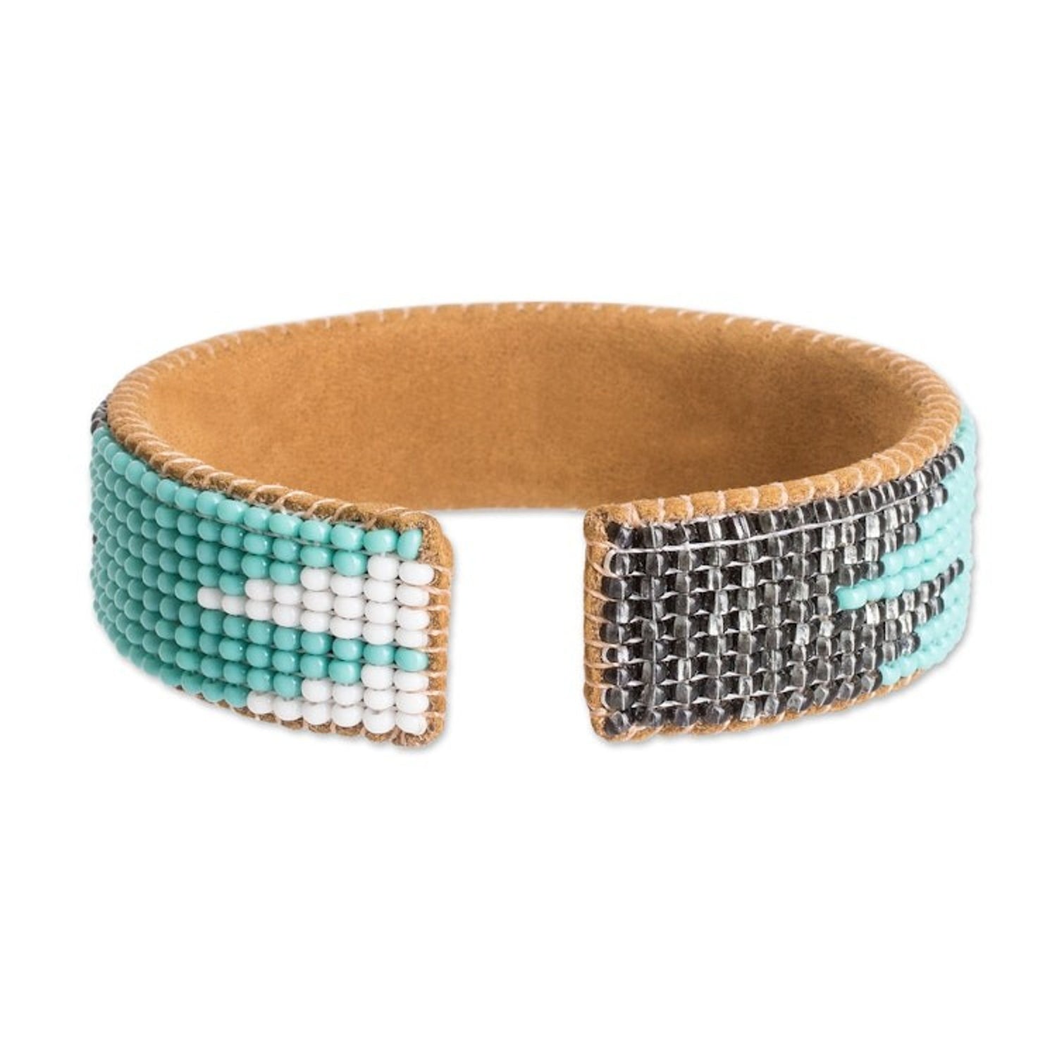 Handcrafted in Guatemala with leather, glass beads, plastic, and nylon. The bracelet is 6.5 inches long and 0.7 inches wide. As a handcrafted item, color and size may vary slightly.