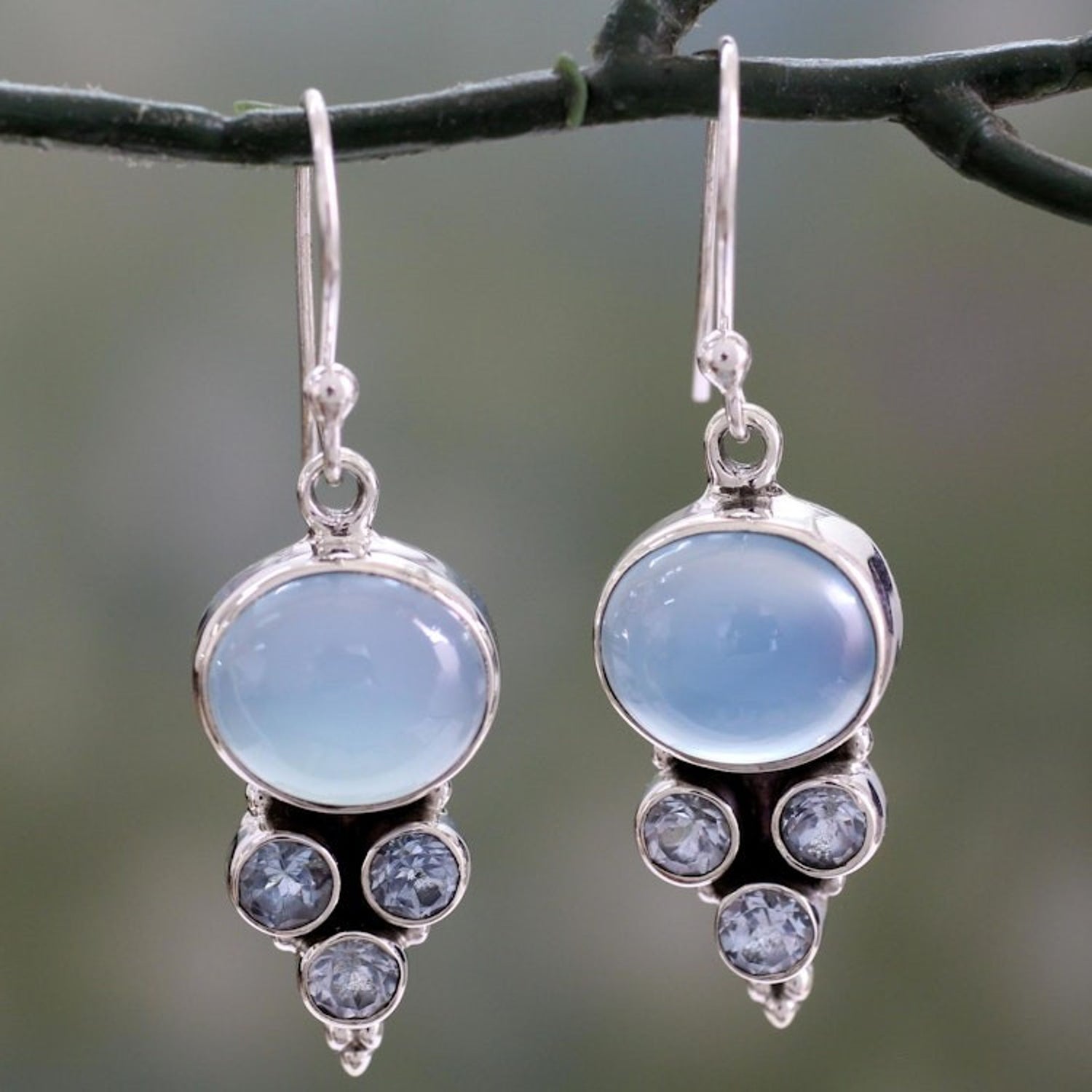 These Light Blue Gemstone Earrings in Sterling Silver Settings 'Bubbling Stream' are a beautiful and delicate accessory. Designed by Shanker, these dangle earrings feature cabochons of light blue chalcedony that trail droplets of blue topaz set in sterling silver with strategic oxidation to enhance the design. The pieces, which are a testament to perseverance and passion, are a beautiful representation of the artisan's commitment to quality and originality.