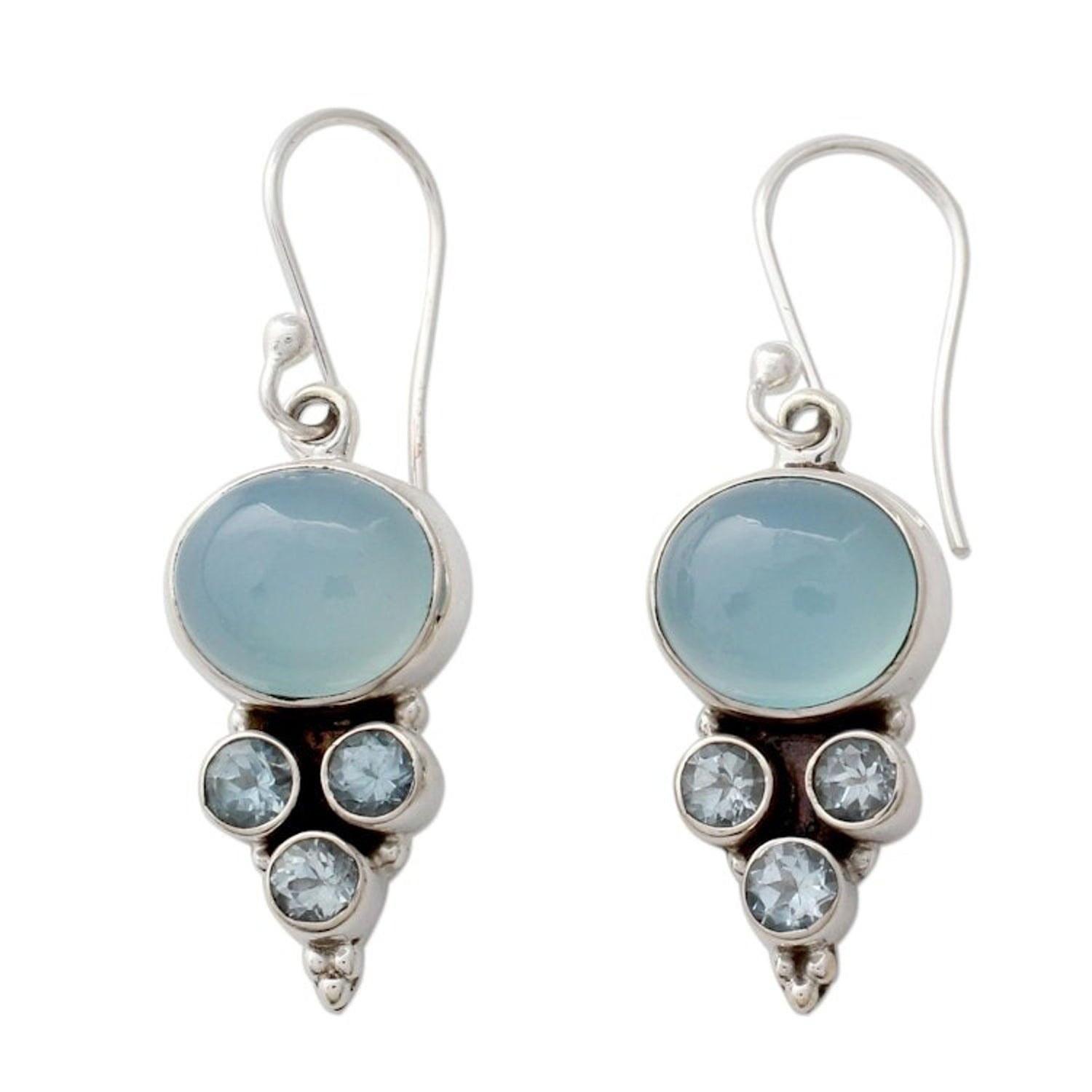 Handcrafted in India with .925 sterling silver, enhanced chalcedony, and blue topaz. Each earring measures 1.6 inches in length and 0.5 inches in width. It has a combination finish.