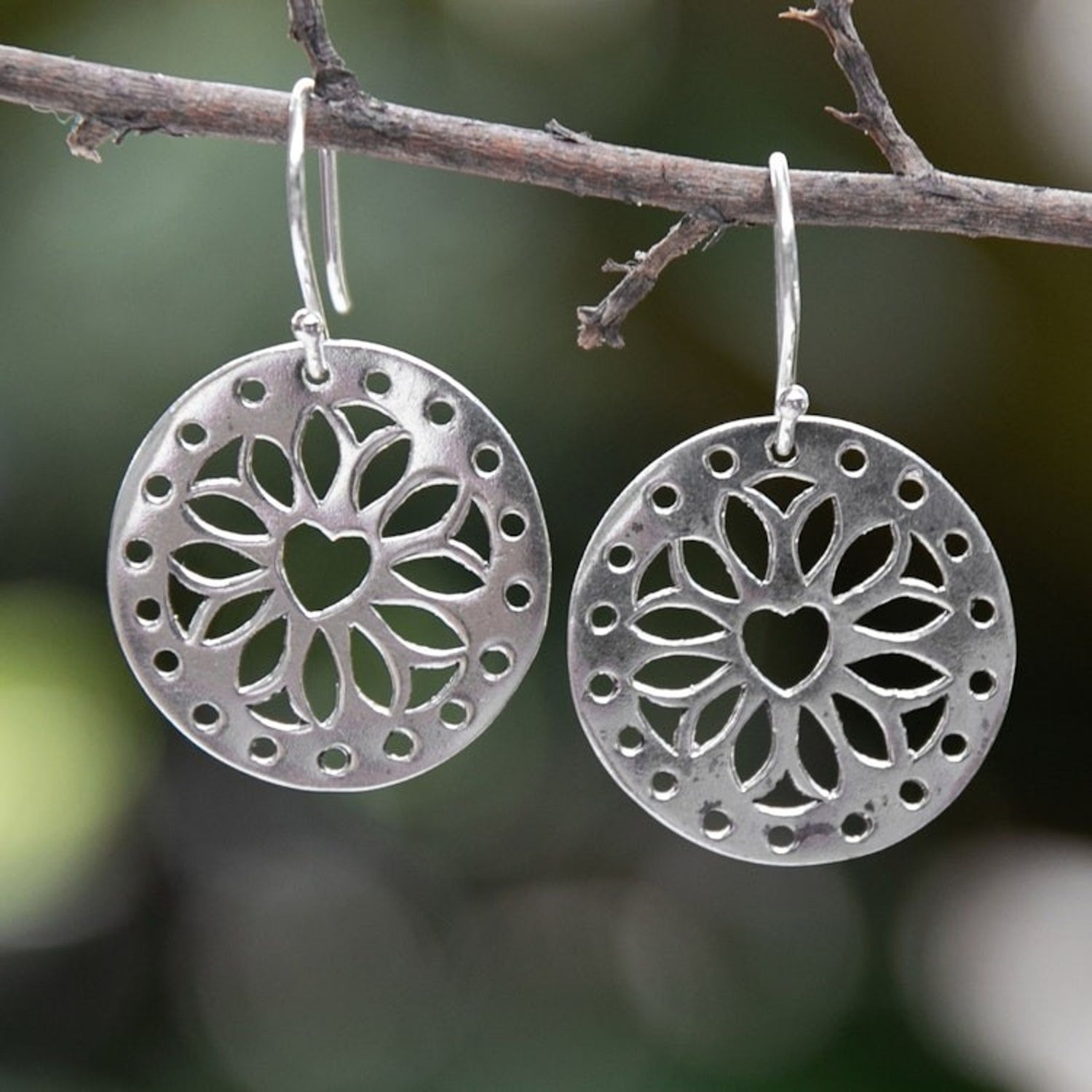 These Lotus and Heart-Themed Round Sterling Silver Dangle Earrings 'Lotus Whisper' are romantic and sweet. Designed by Griya Suarningsih, these sterling silver round dangle earrings feature a combination of floral and heart motifs, with tender lotus petals in a high-polish finish. The pieces, which celebrate artistry and resilience, are a beautiful representation of the artisan's commitment to honoring heritage, supporting her community, and creating beauty that connects the past with the present.