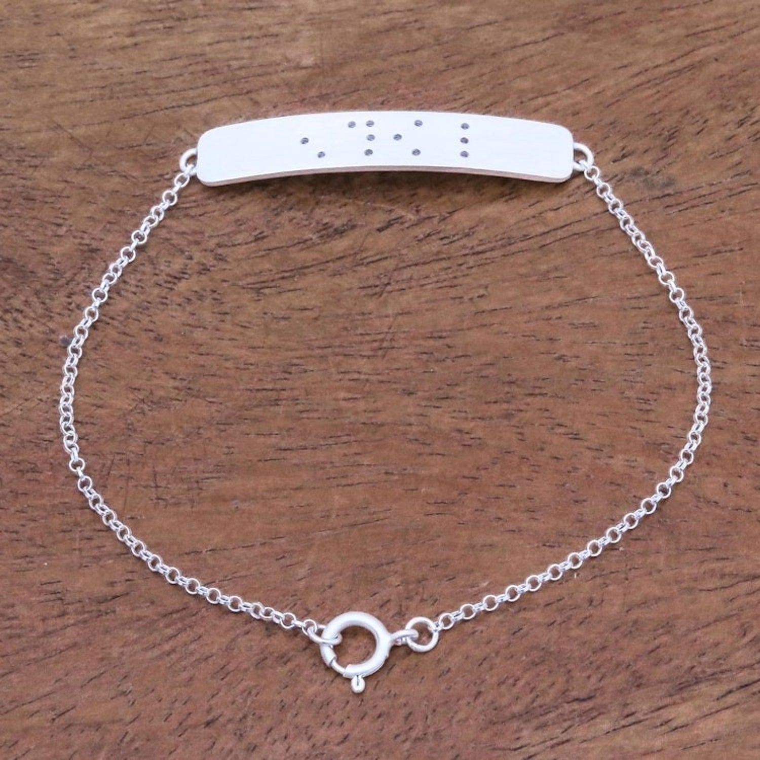 This Love-Themed Braille Cutout Sterling Silver Pendant Bracelet 'Love Dots' is a delicate and modern accessory. Designed by Jantana, this bracelet features a sterling silver pendant with dot perforations that read "love" in Braille. The piece, which celebrates love and creates opportunities for others, is a beautiful representation of the artisan's commitment to sharing joy, beauty, and craftsmanship with the world.