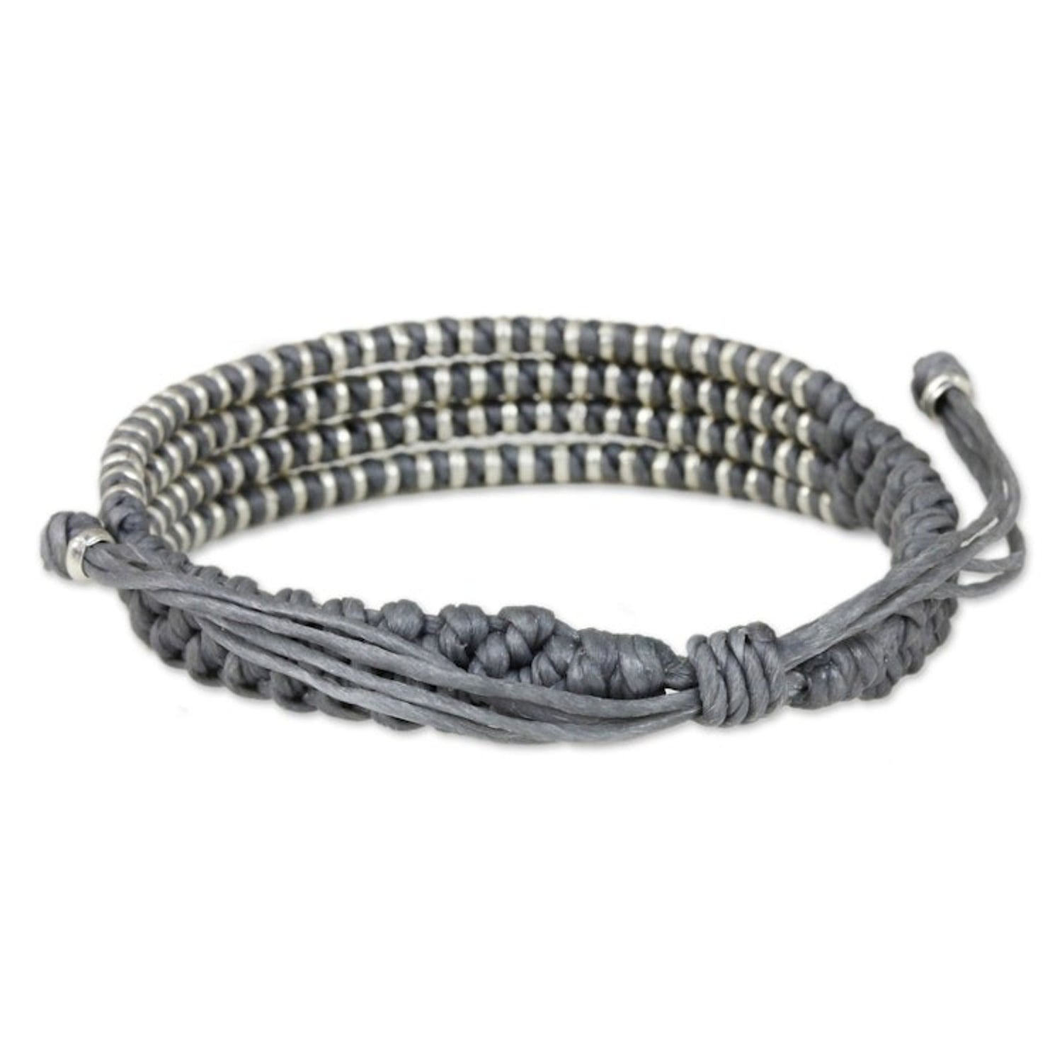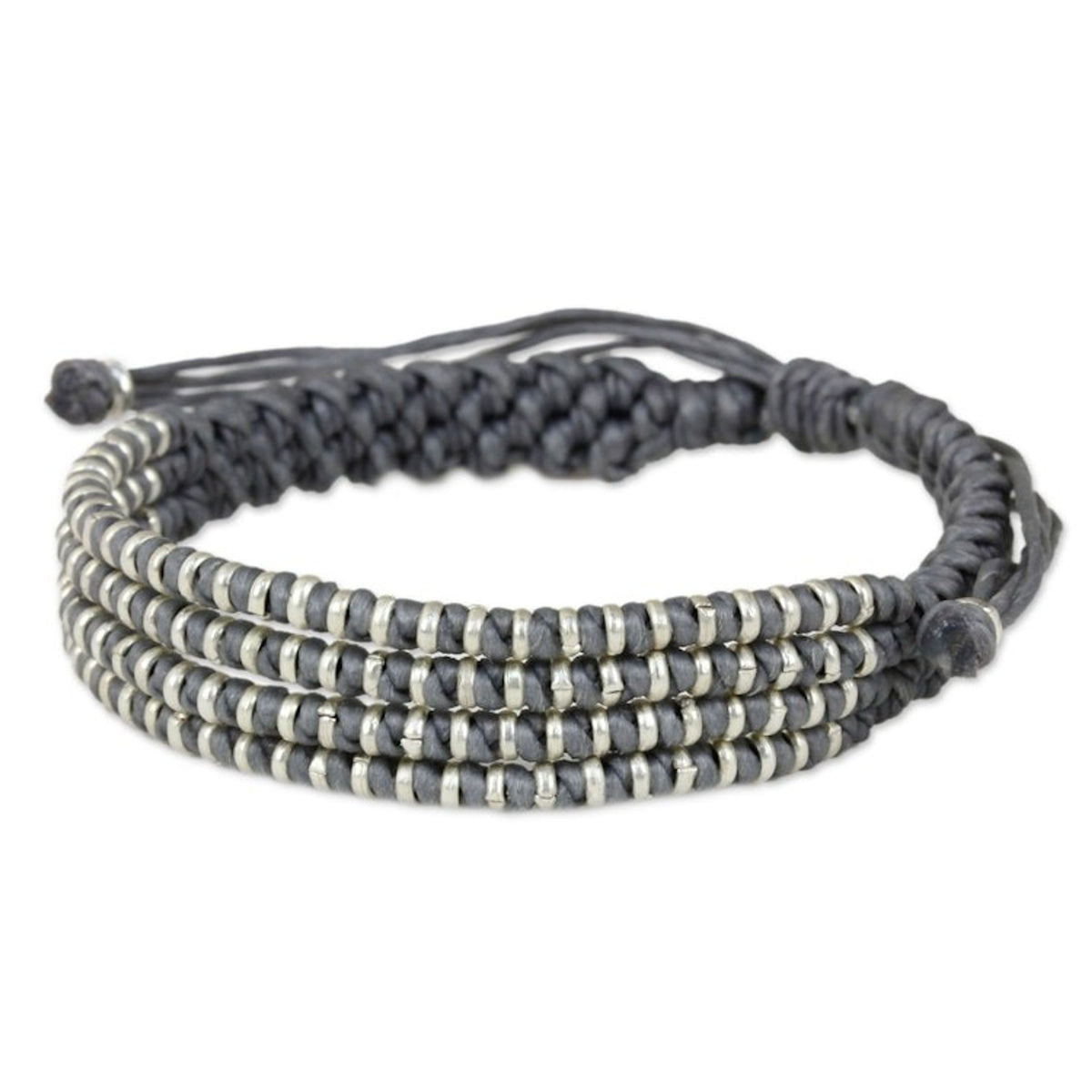 Handcrafted in Thailand with .950 silver and waxed polyester cords. The bracelet is adjustable from 6.3 to 9 inches in length. It has a matte finish.