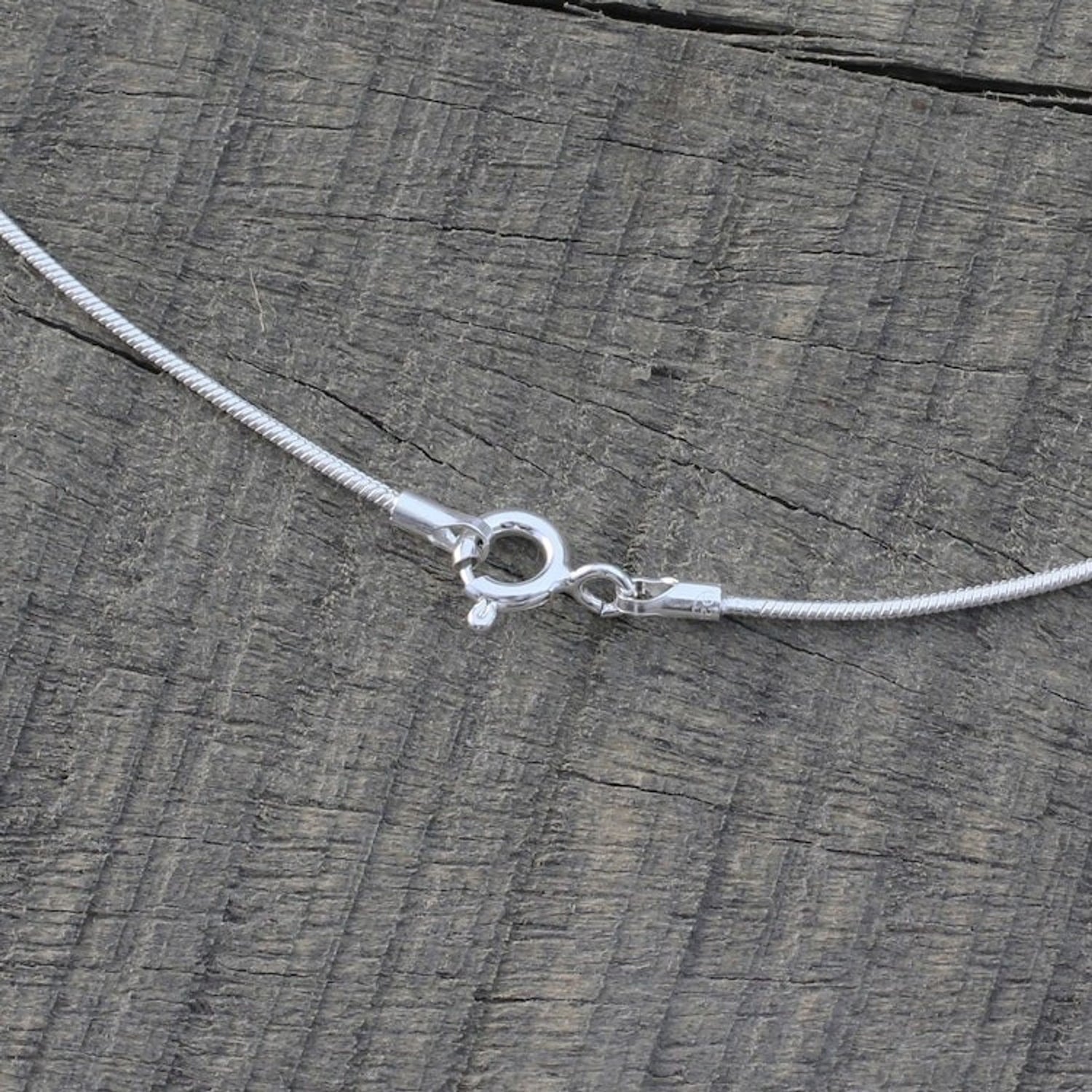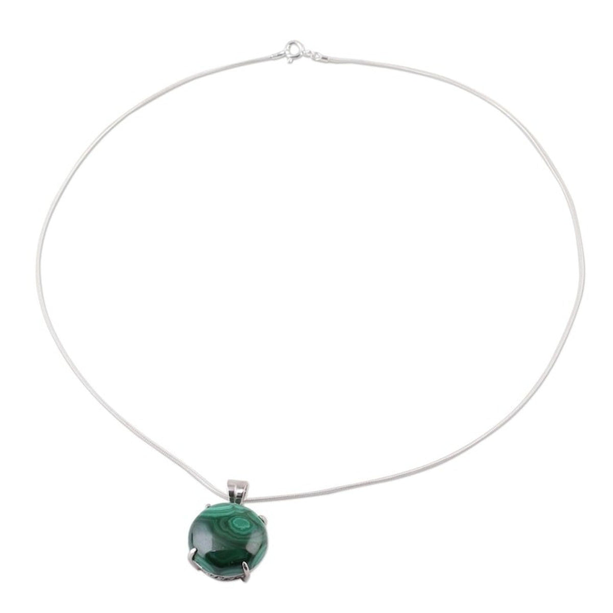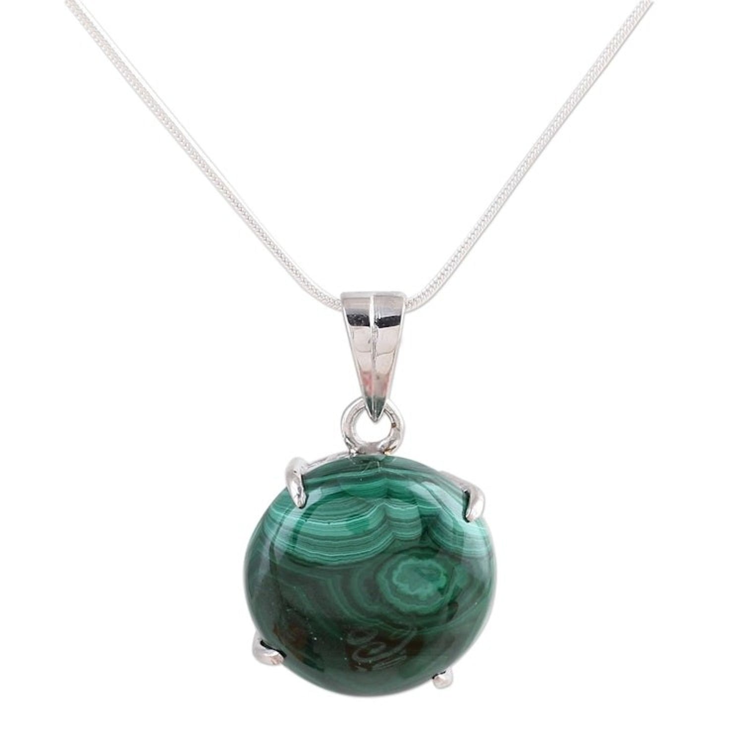 Handcrafted in India with rhodium-plated .925 sterling silver and malachite. The necklace is 17.8 inches long. The pendant measures 1.2 inches in length and 0.8 inches in width. It has a high-polish finish. Natural variations in color and/or pattern are to be expected.
