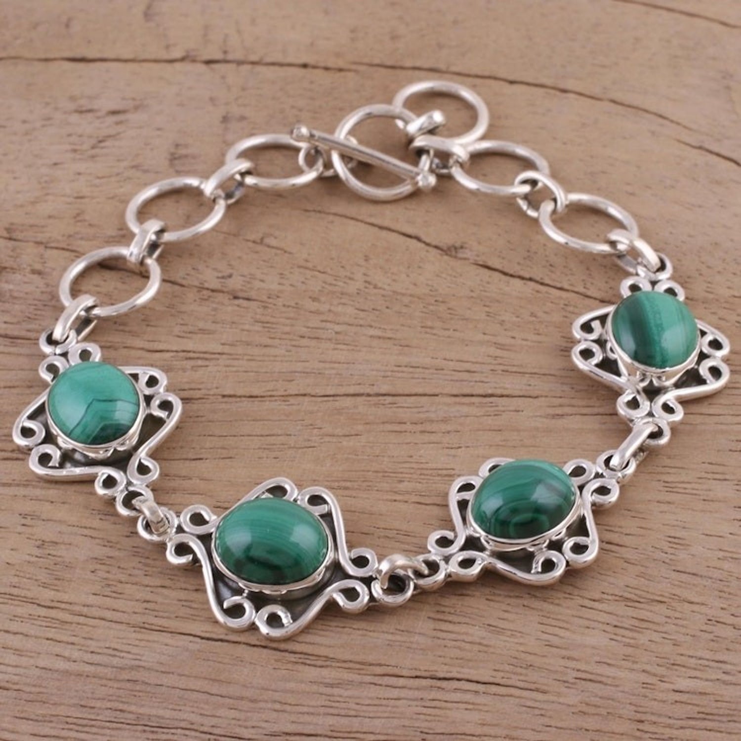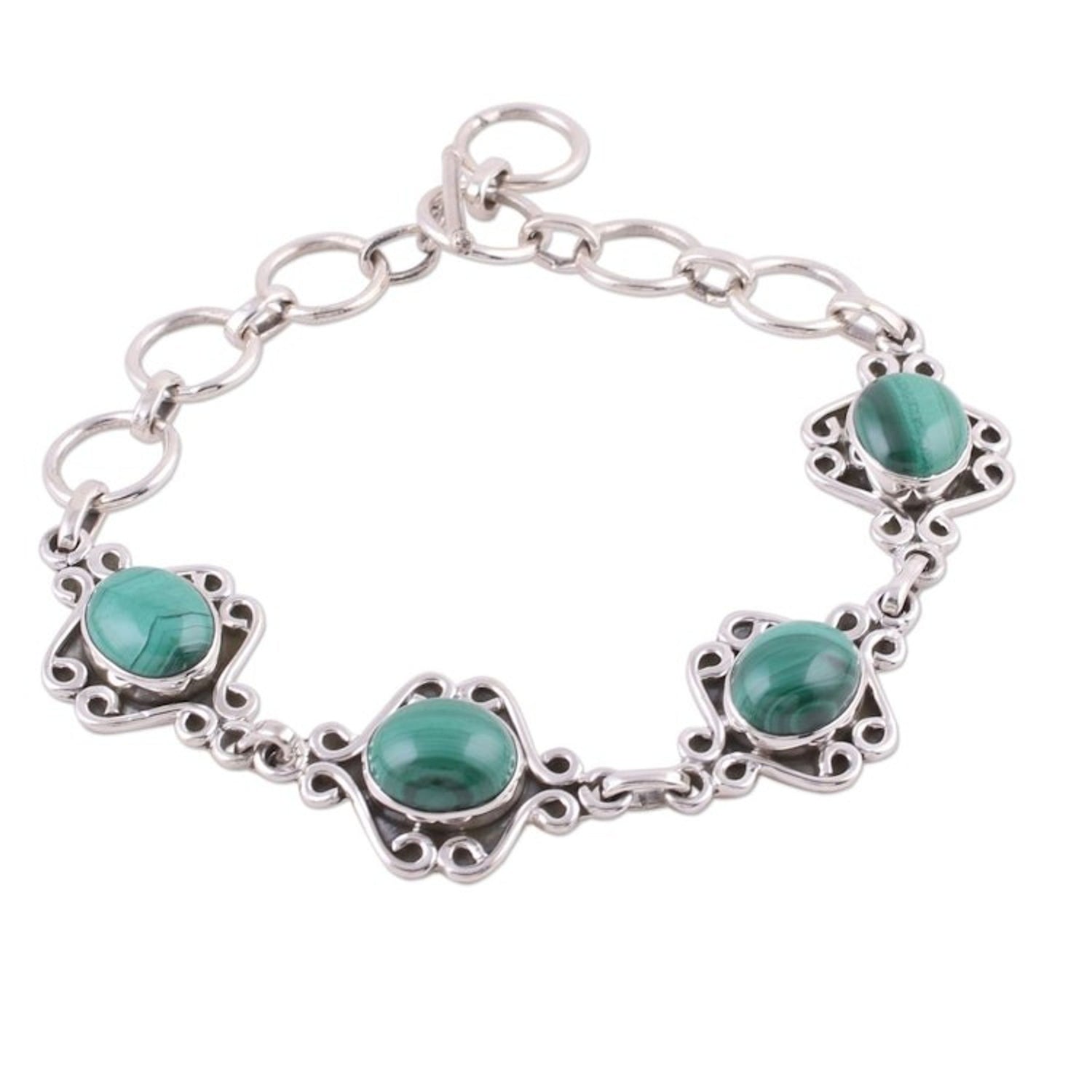 This Malachite Swirling Link Bracelet Crafted in India 'Lush Connection' is a lush and elegant accessory. Designed by Aparna, this adjustable link bracelet features four links crafted of sterling silver with petite swirling designs, crowned with lush natural malachite cabochons. The piece, which embodies artistry, resilience, and devotion, is a beautiful representation of the artisan's commitment to carrying forward her family's creative spirit.
