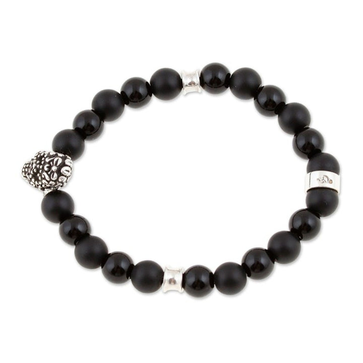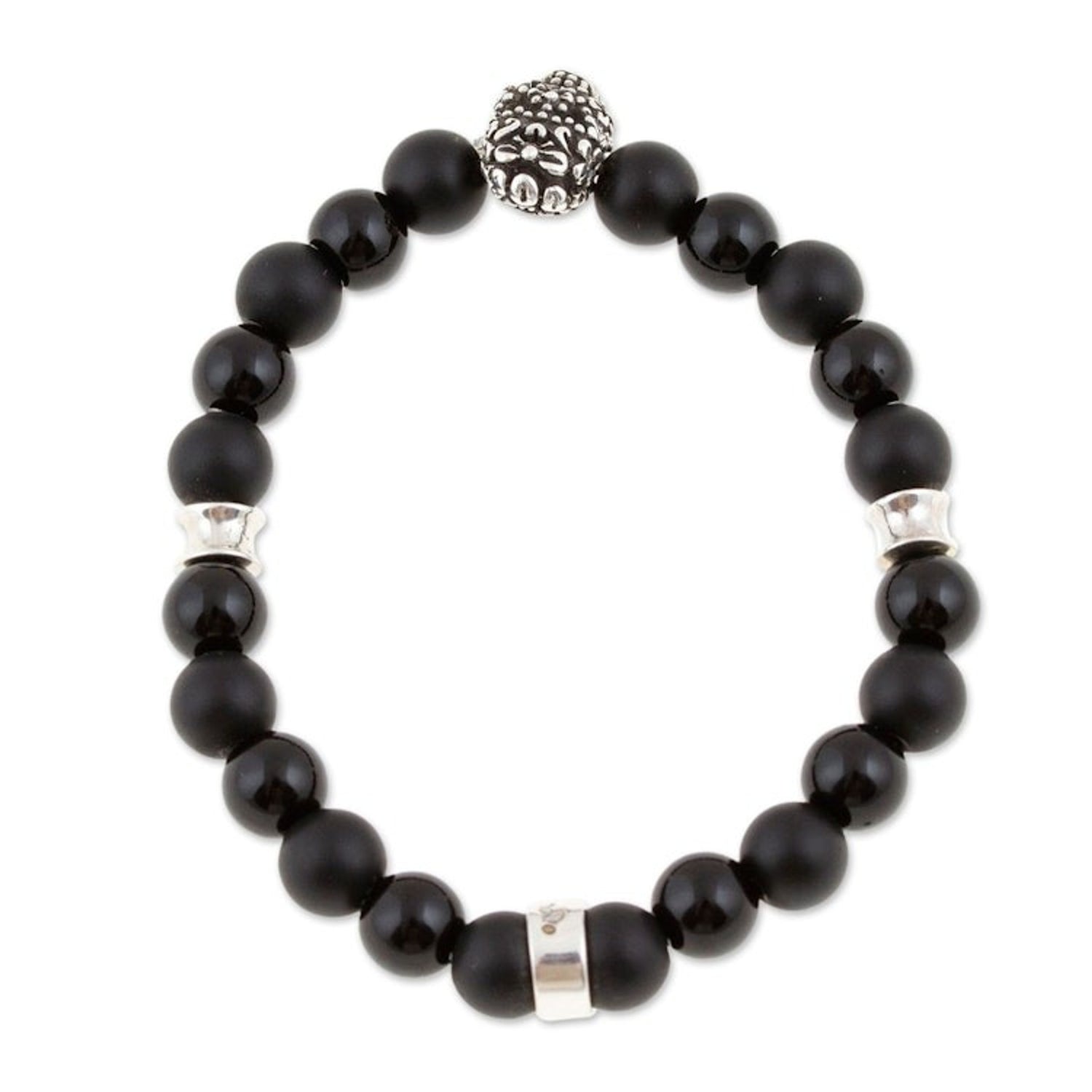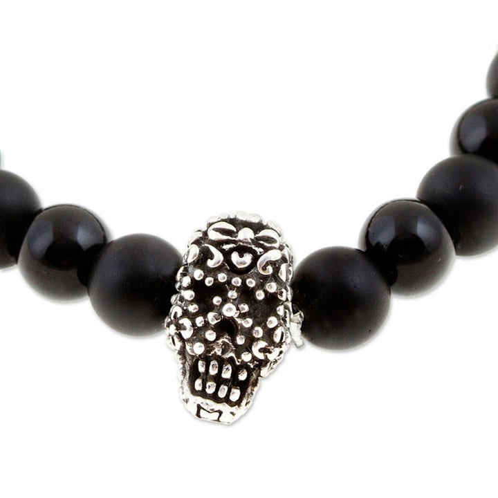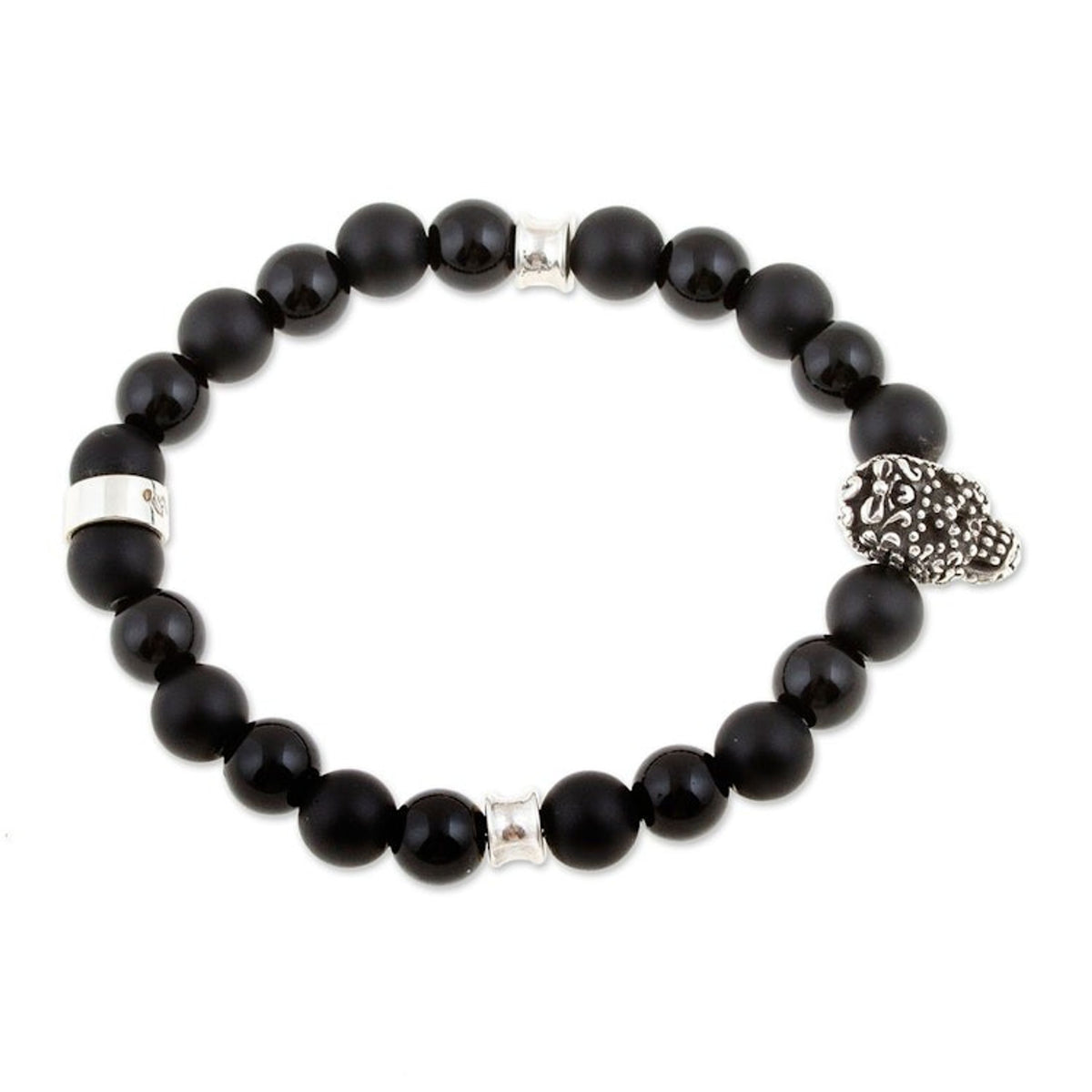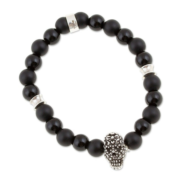 Men's Onyx Stretch Bracelet with Taxco Silver Skull Pendant 'Enchanted Skull'