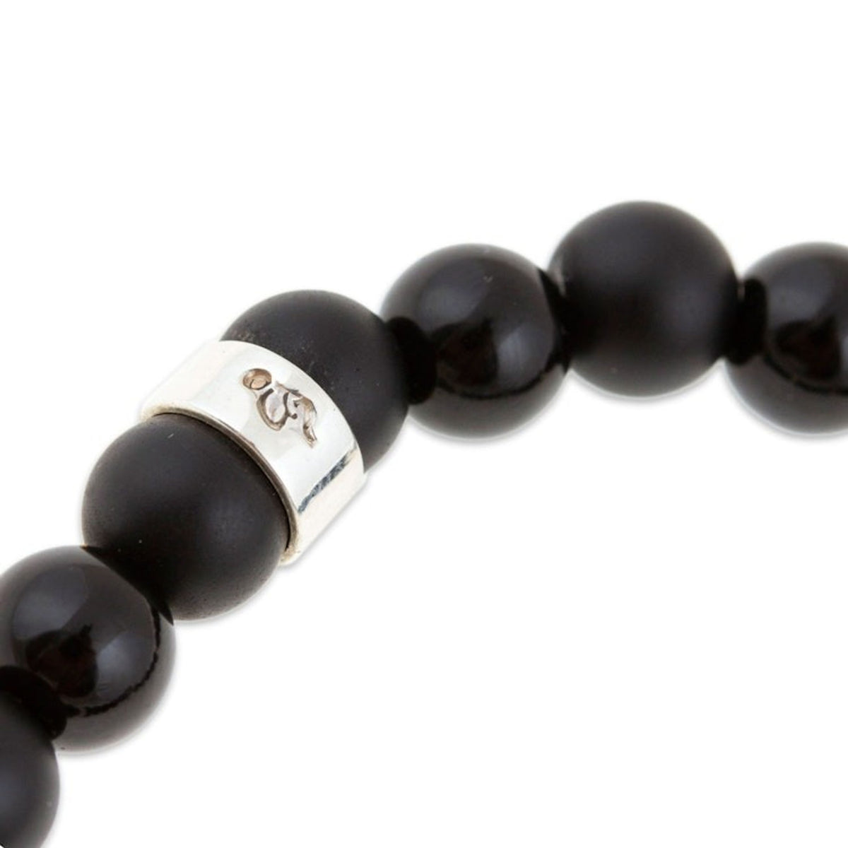 Handcrafted in Mexico with onyx, .925 sterling silver, and elastic cord. It is adjustable from 7 to 7.8 inches in length. It has a combination finish. As a handcrafted item, color and size may vary slightly.
