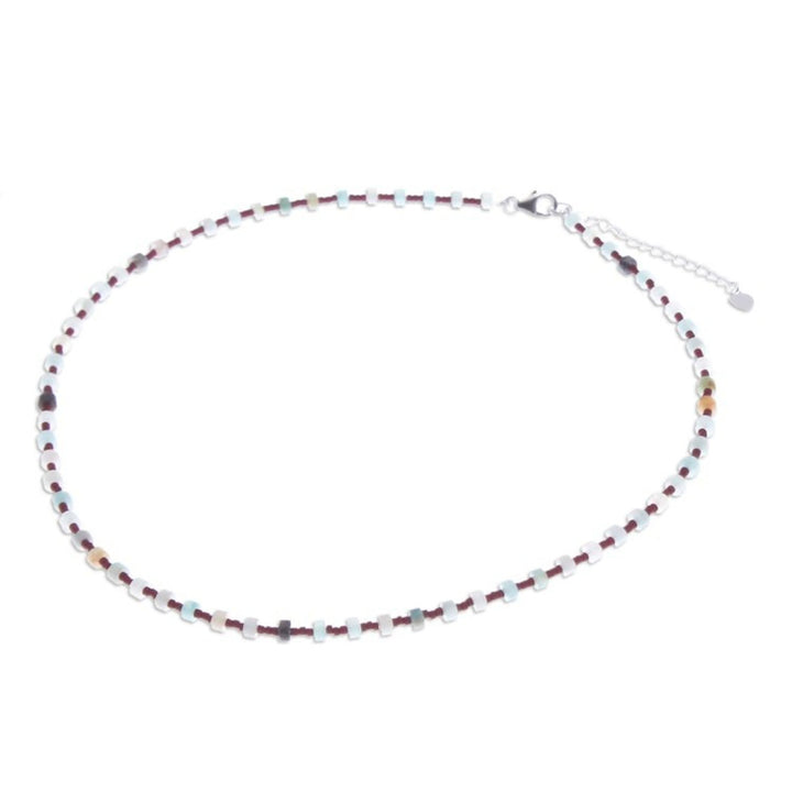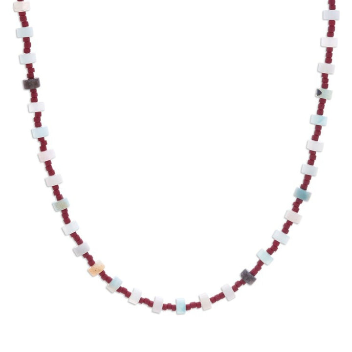 This Men's Quartz and Glass Beaded Necklace Crafted in Thailand 'Intense Signs' is a refreshing and vibrant accessory. Designed by Srimuang, this necklace is crafted from quartz and glass beads in a palette of white and red tones. The piece, which carries freshness and individuality, is a beautiful representation of the artisan's commitment to crafting jewelry that others cherish.