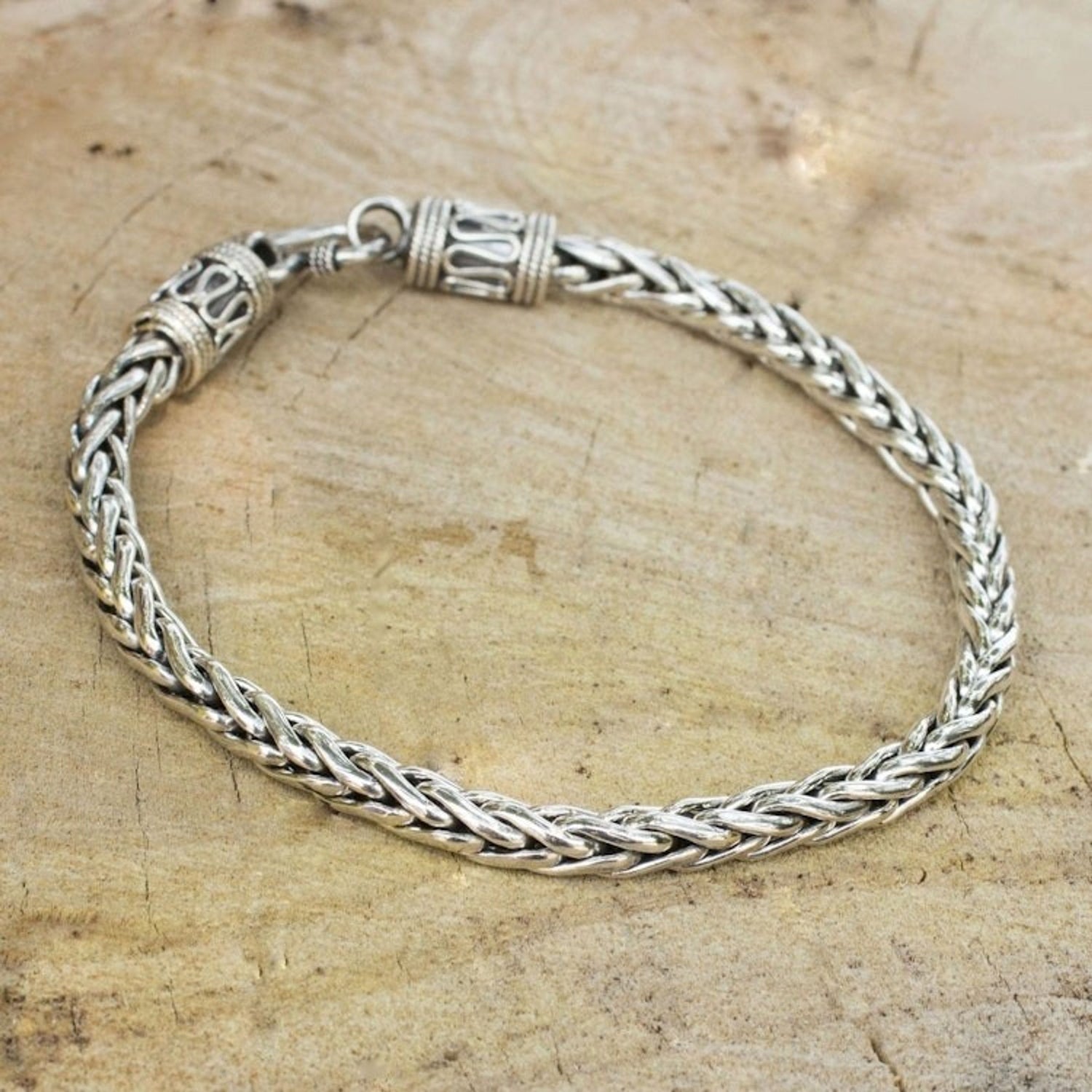 This Men's Sterling Silver Chain Bracelet from Thailand 'Strength' is a beautiful and strong accessory. Designed by Achara, this sterling silver bracelet is fashioned from a burnished braid with ornate cylinders that flank the clasp. The piece, which bridges heritage and contemporary elegance, is a beautiful representation of the artisan's commitment to sustaining Thai and hill tribe culture while supporting artisans.