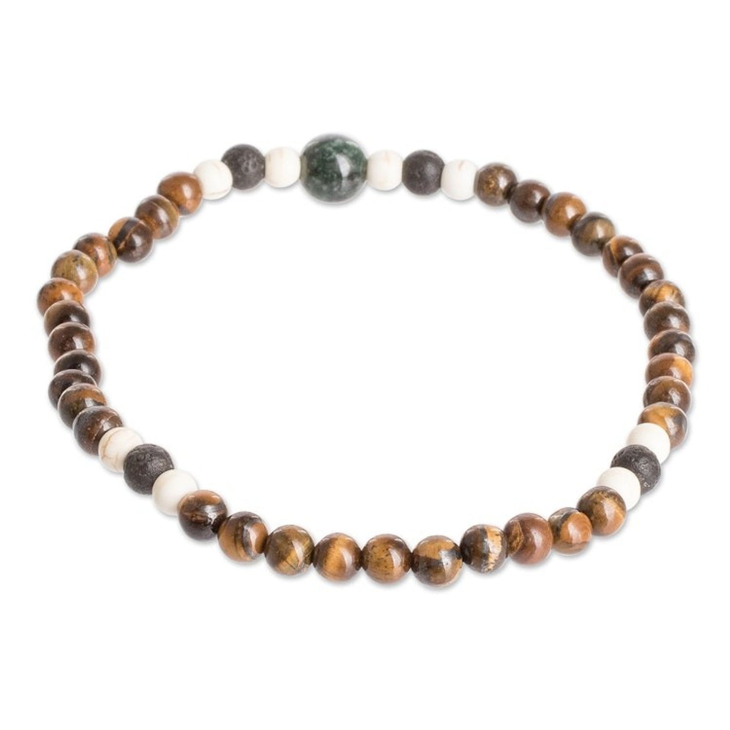 Handcrafted in Guatemala with tiger's eye, jade, resin, and lava stone beads on an elastic cord. The bracelet has an inner circumference of 7.5 inches and is 0.2 inches wide. As a handcrafted item, color and size may vary slightly.