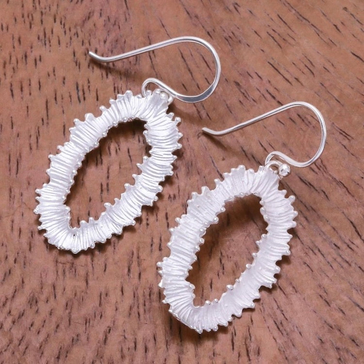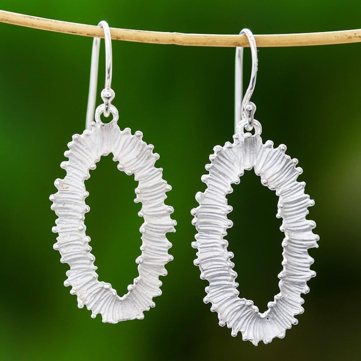 This Modern Abstract Sterling Silver Dangle Earrings 'Wavy Rings' is a contemporary and striking accessory. Designed by Pichaya, these sterling silver dangle earrings feature two oval rings with a wavy pattern and a combination of finishes. The piece, which blends contemporary simplicity with echoes of the past, is a beautiful representation of the artisan's commitment to creating versatile jewelry for daily wear.