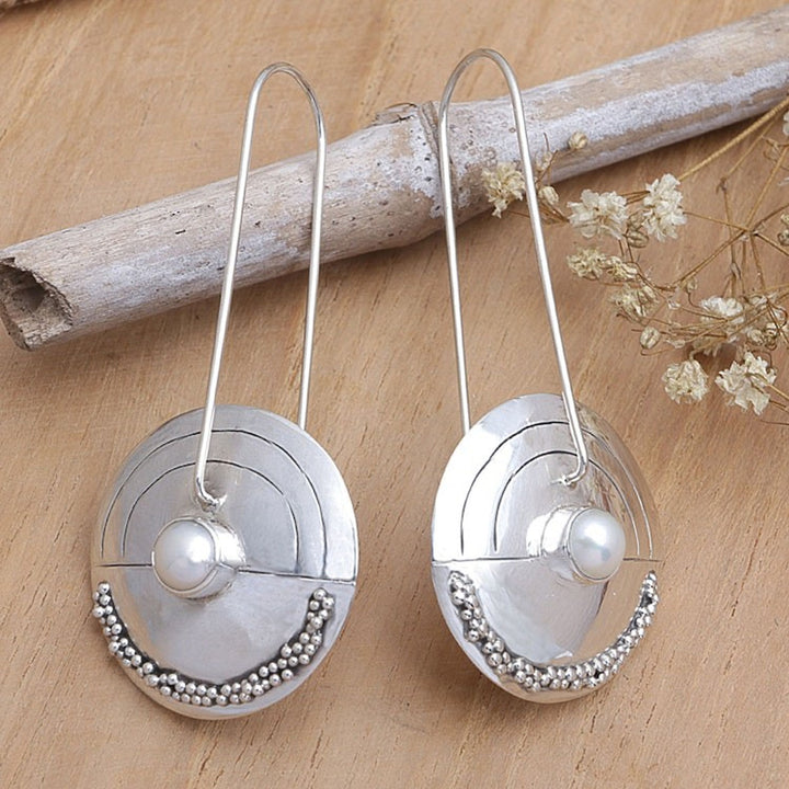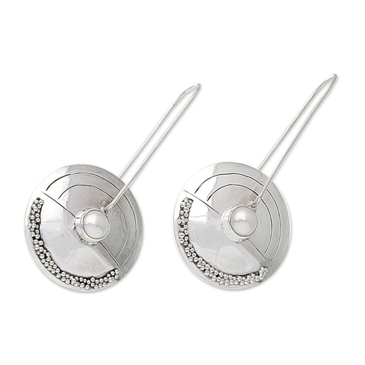 These Modern Pearl Sterling Silver Drop Earrings 'Moonlight Sand' are a beautiful and modern accessory by Balinese artisan Nyoman Rena. The sterling silver earrings feature slender wires affixed with pearly freshwater pearls, giving them a radiant glow. The piece reflects Rena's distinctive style that captures both Balinese heritage and contemporary design, as he shares Bali's artistry with the world.
